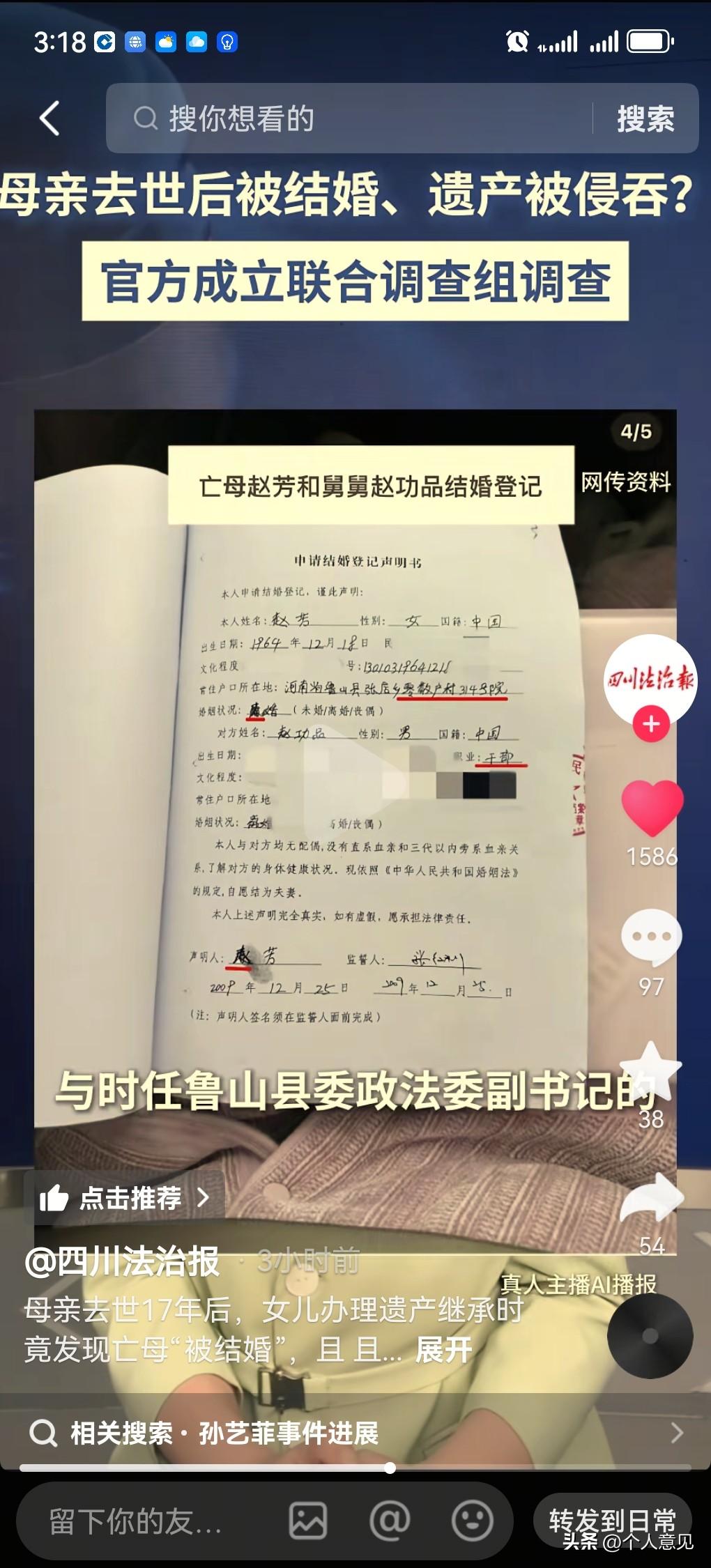 这就有点扯了,就是短剧也不会这么拍吧? 媒体报道,河南一女子的母亲去世十七年来,估计那时女子年龄应该小,现在这个女子准备办理继承公证,发现:死了十七年的母亲被结婚,结婚的对象还是亲舅舅,结婚证上照片是舅妈。而且母亲去世十几天后房产过户给了其小姨! 目前可知道的消息是女子的亲舅舅当时是鲁山县政法委副书记。目前鲁山的纪委会同相关部门以介入调查! 世界真奇妙! 我个人盲猜这种操作的目的要不是拆迁需要,但很大可能是通过这种形式合法获得死亡人的遗产,而此遗产值得深究一下来源! 再盲猜:爆料人可能确实不知情,也可能知情,那无非就是利益不均衡或者胃口的问题了! 就是瞎嚼舌根子。 一切以调查结果为准!