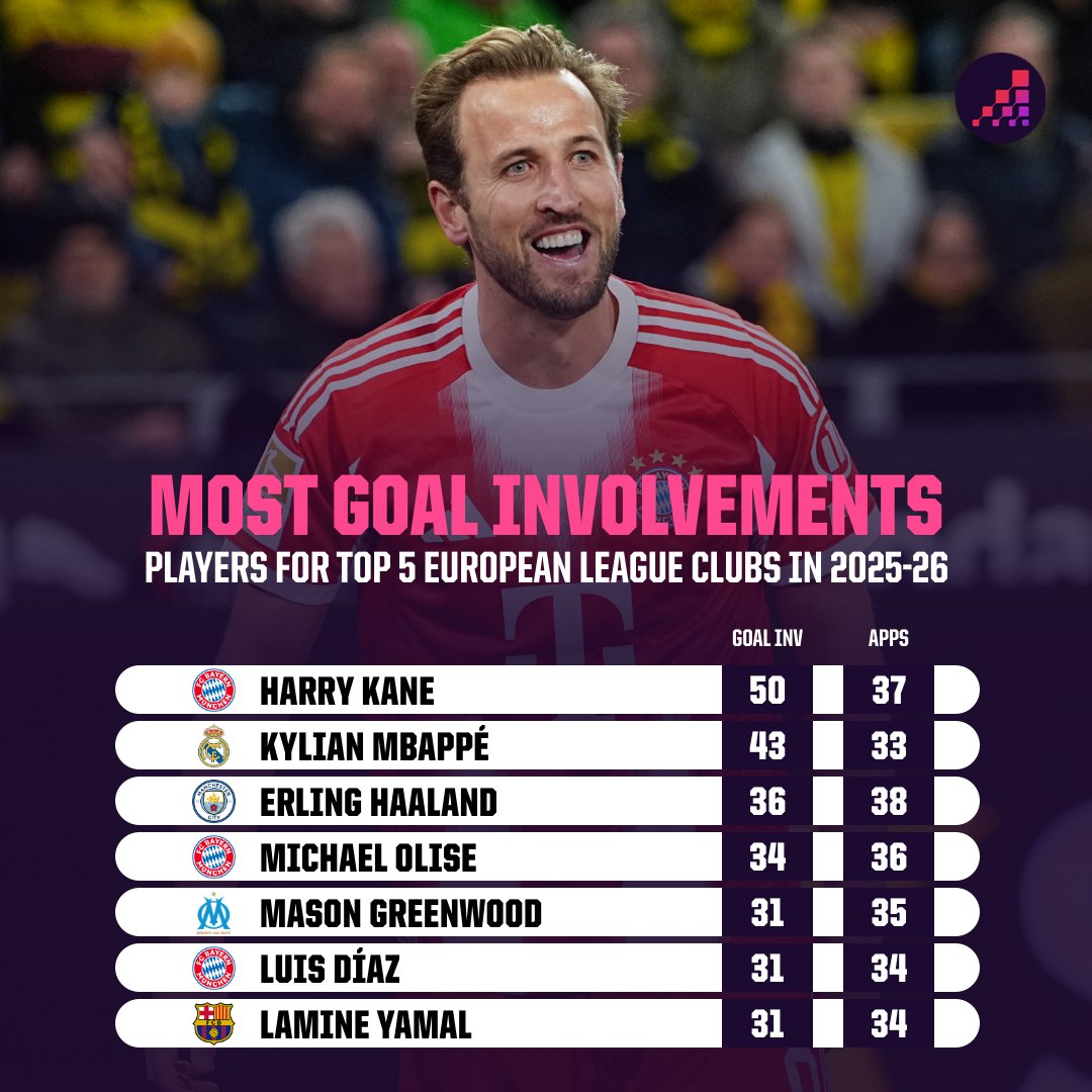 虎扑03月03日讯著名统计机构OPTA日前公布了本赛季五大联赛参与进球最多的排行,凯恩50球居首,姆巴佩哈兰德紧随其后。具体榜单如下。
