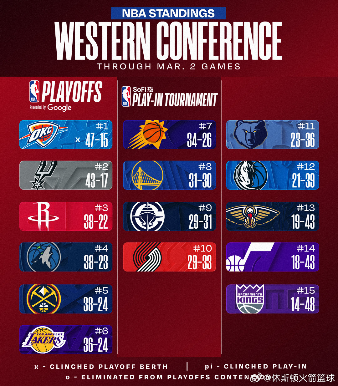 今日比赛过后,火箭继续排名西部第三,领先第四的森林狼半个胜场👀