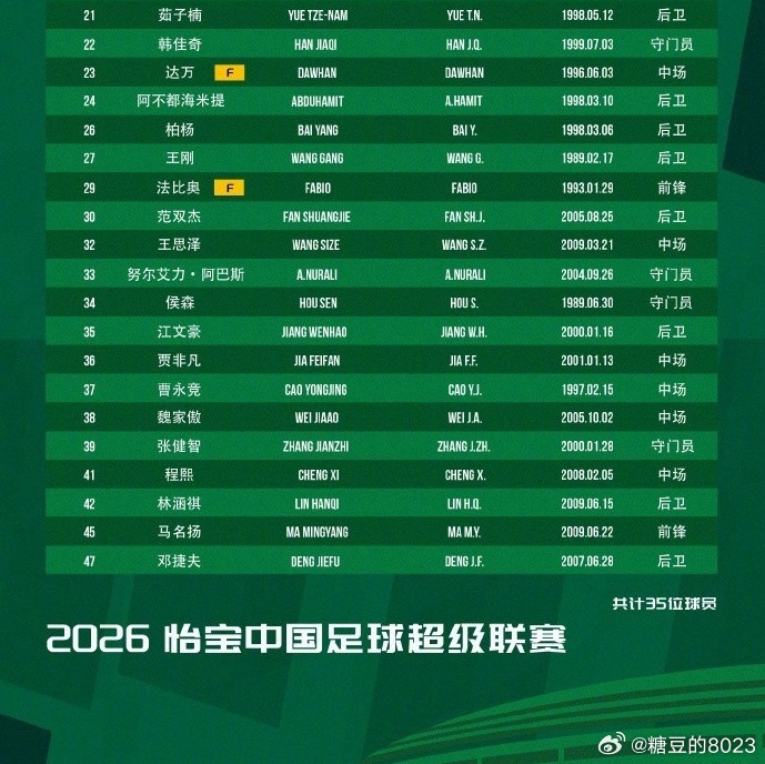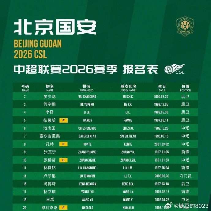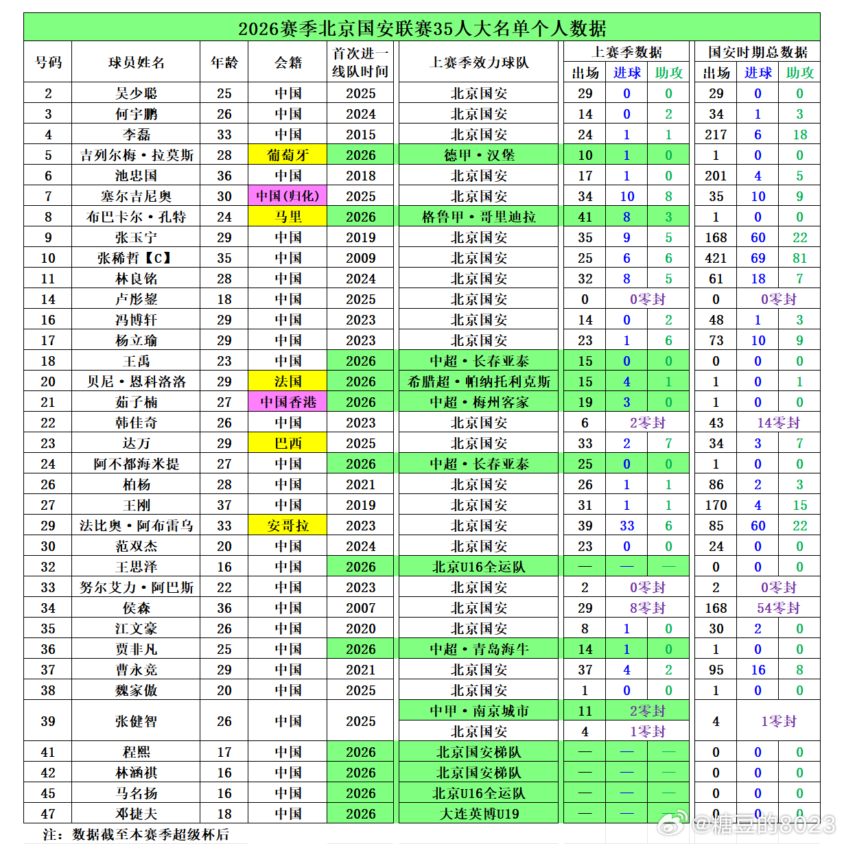 【图4】📊北京国安2026赛季联赛大名单35名球员球员个人历史数据。·