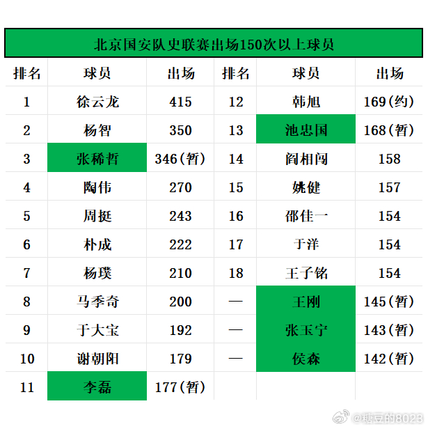 ⚽王刚:联赛出场145次⚽张玉宁:联赛出场143次⚽侯森:联赛出场142次➡️以上3人接近完成国安生涯联赛150场里程碑,队史仅18人达到此项数据📊【图5】