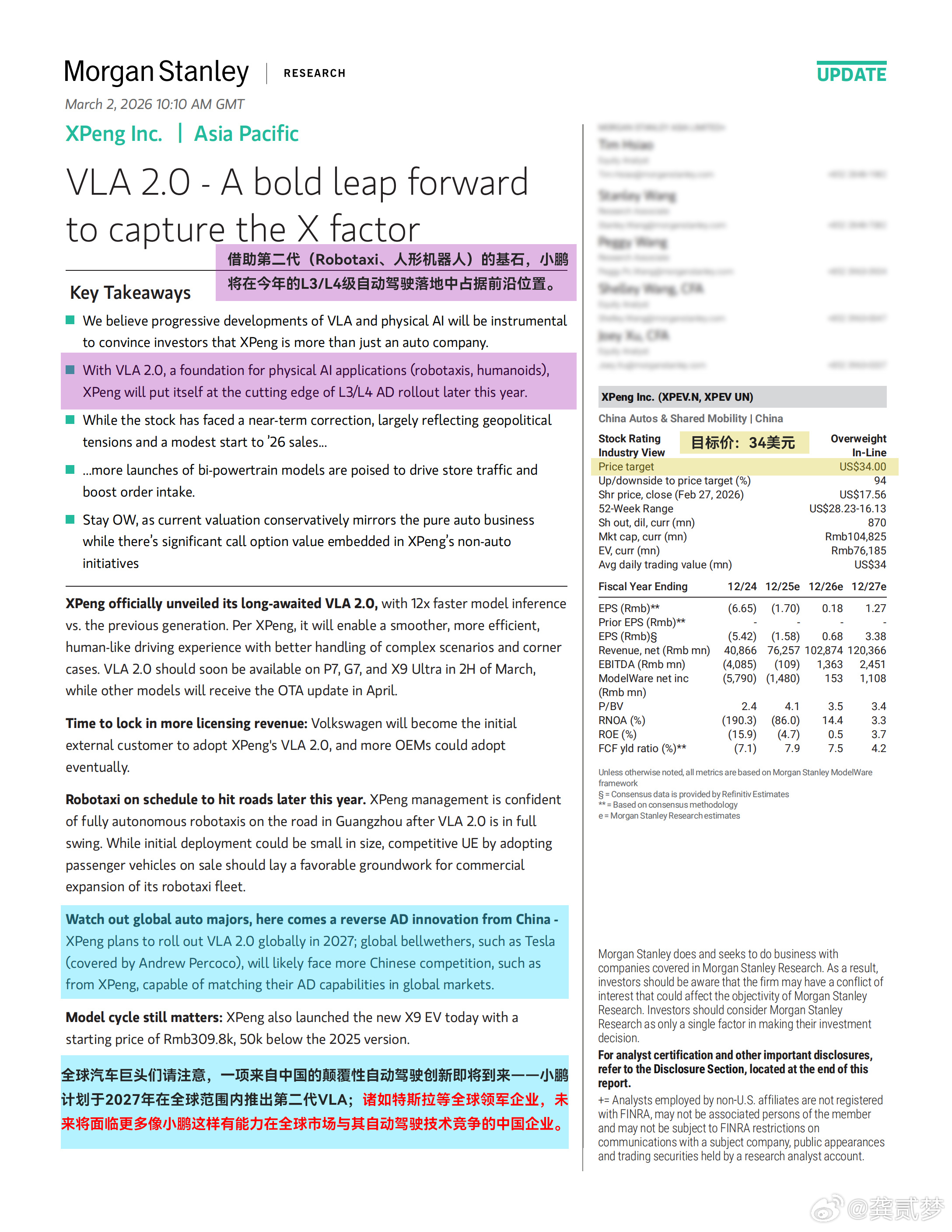 所以昨天发完第二代VLA没多久,摩根士丹利、美国银行、汇丰银行在内的多家全球头部券商强推小鹏,给出“买入”评级。所以,资本层面是接受的啊,而且对于小鹏这种技术创新型企业,资本最看重的就是技术路线前瞻性和可持续性,说白了就是商业化的潜力。