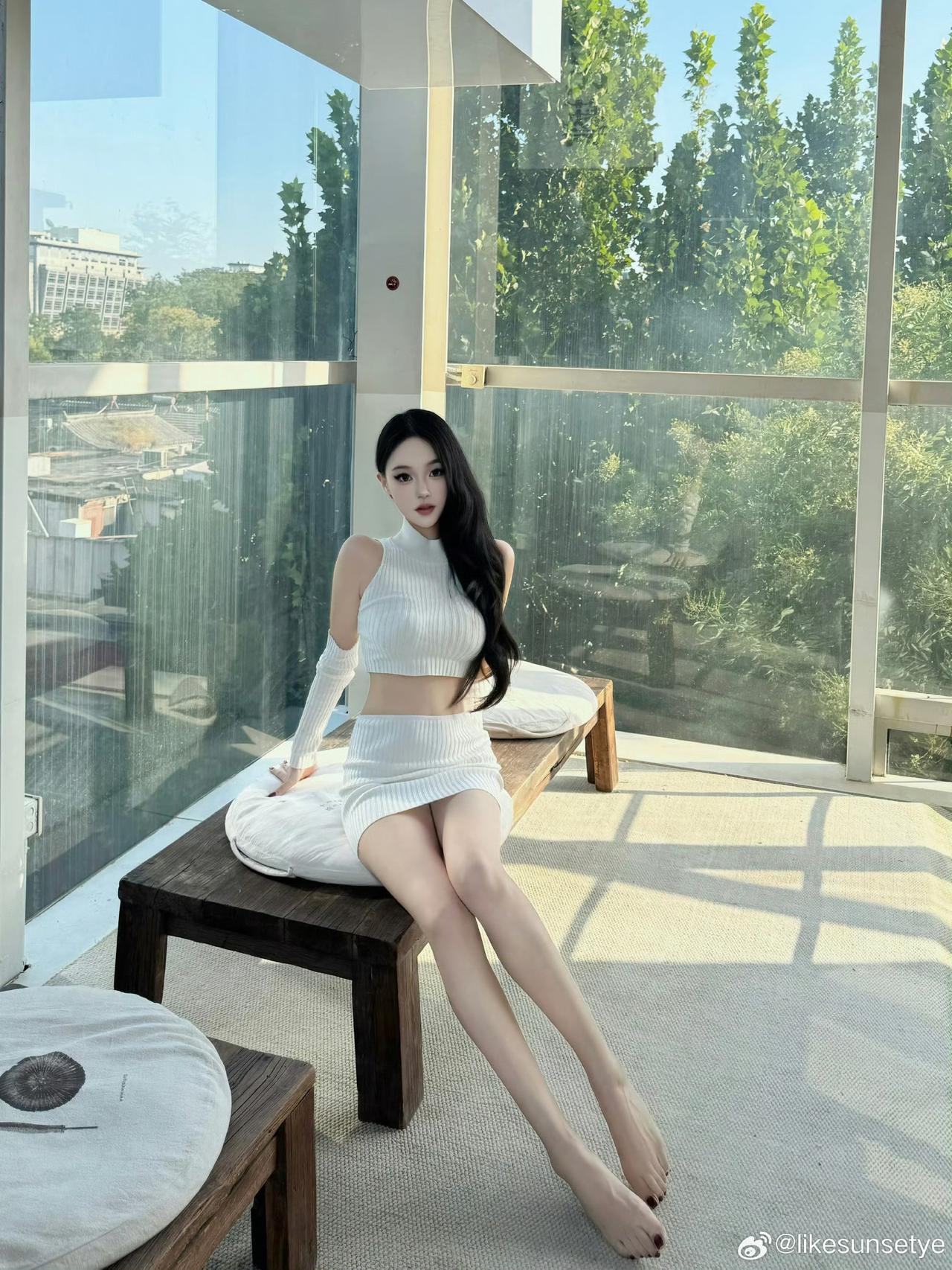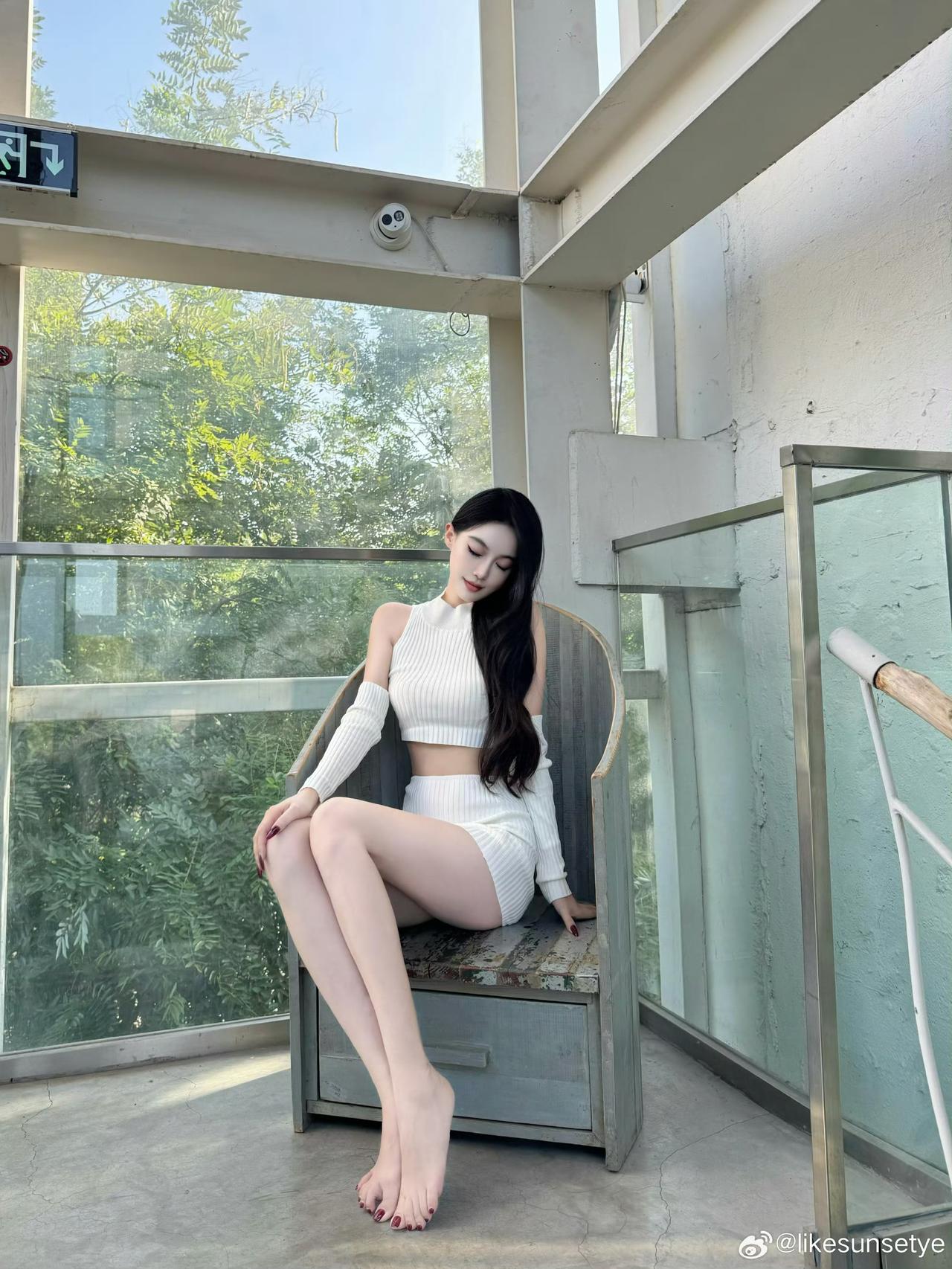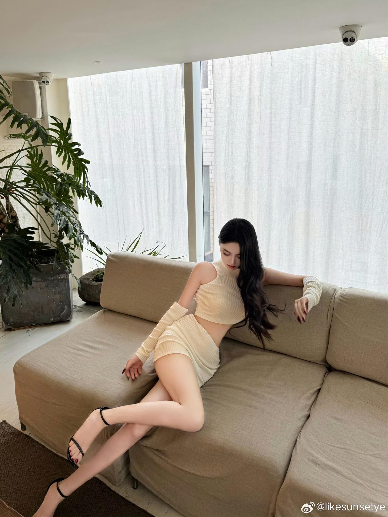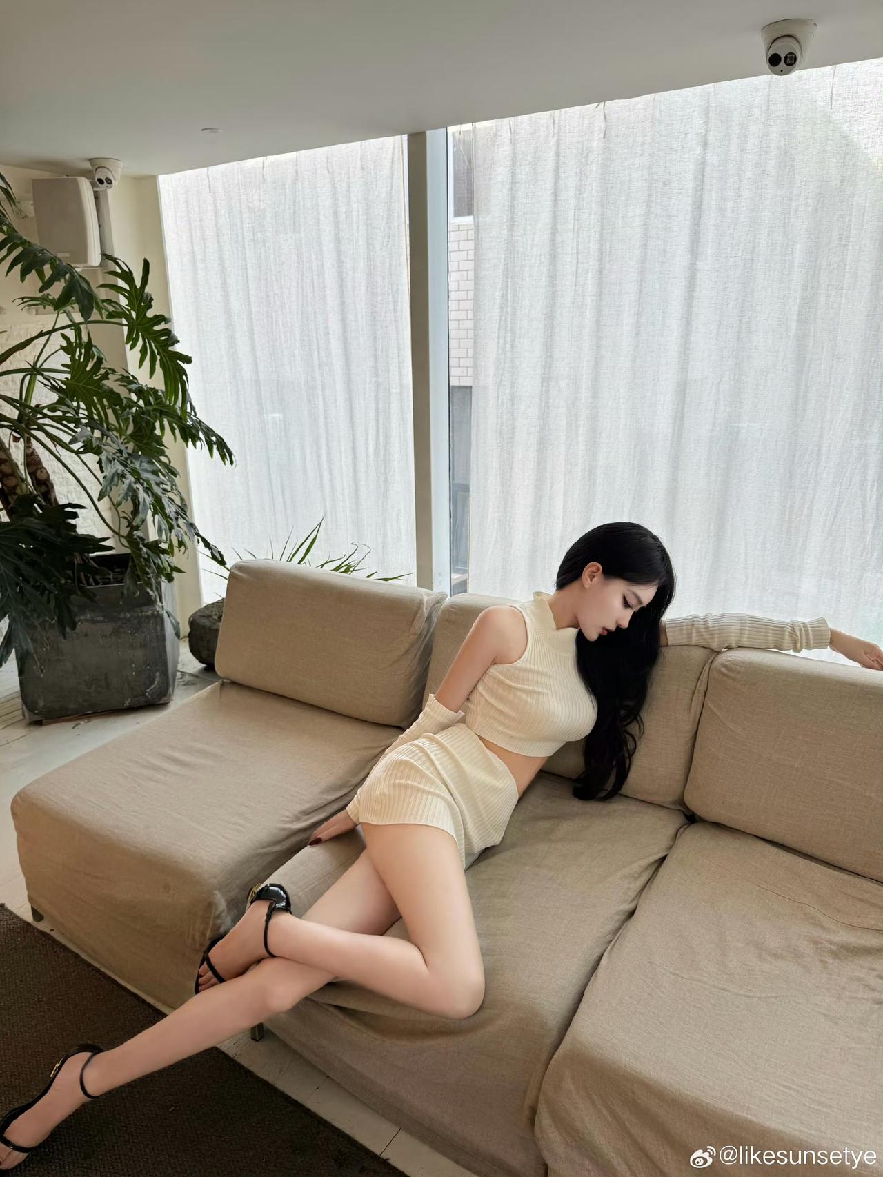 优雅坐卧,米色套装搭配黑色高跟鞋,尽显时尚魅力。