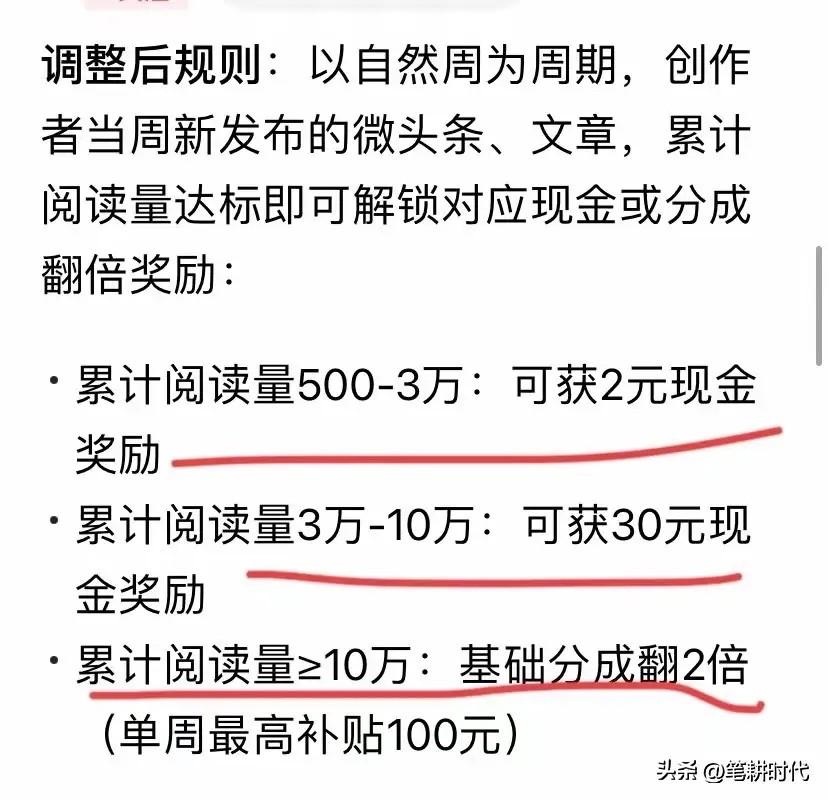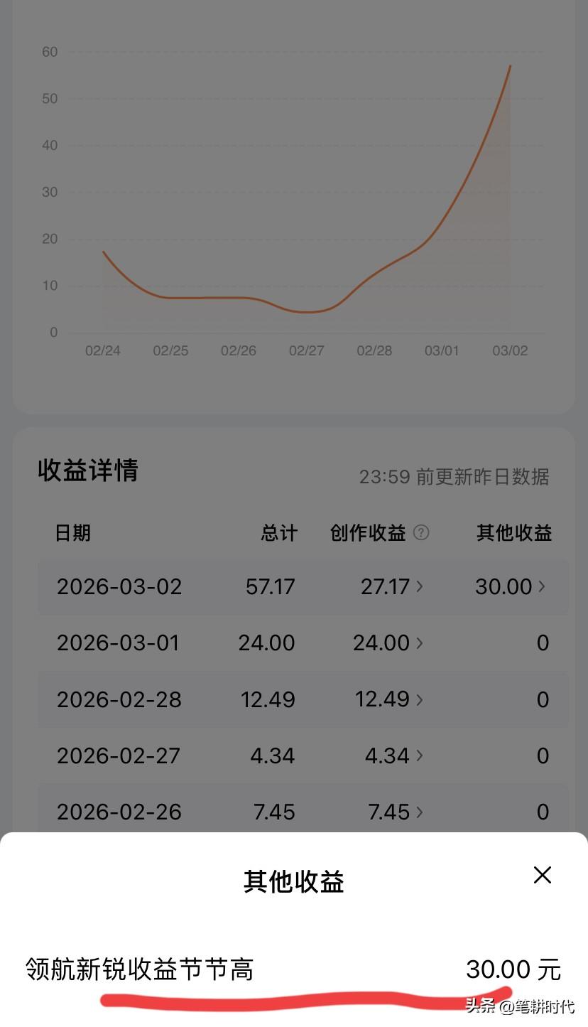 还是白高兴一场!今日收益出来吓一跳!一看一万阅读量,收益栏显示竟然有57元!一阵暗喜后紧接着就失望了! 这段时间太忙,没什么宽裕时间写文章,见缝插针写写微头条敷衍了事。 也真想不到随便写写,居然也有上万阅读量,去初看这个收益一阵喜悦,毕竟写的是微头条,不是文章,要是这么高的单价肯定很兴奋。 直到刷到别人的微头条,忽然想起来,怀疑这个收益不是单纯阅读量的收益。我才再次去翻看收益,一下子高兴不起来。 看到条友今天有领航新锐节节’奖金到账,我仔细点开收益提现,发现有其他收益30元。 我把这个奖金都忘到九霄云外了,上周还有100奖金,总阅读量有10万多,这周阅读量急剧下降,大概也就3万多吧!原来3万多也有奖金的。 看下周能否接住100奖金?目前阅读量快达到三万了,还有5天,有幸出一两个爆款,就能达到十万了。 这个100元奖金是真金白银,现在不景气的时候,不知要写多少字才能获得?