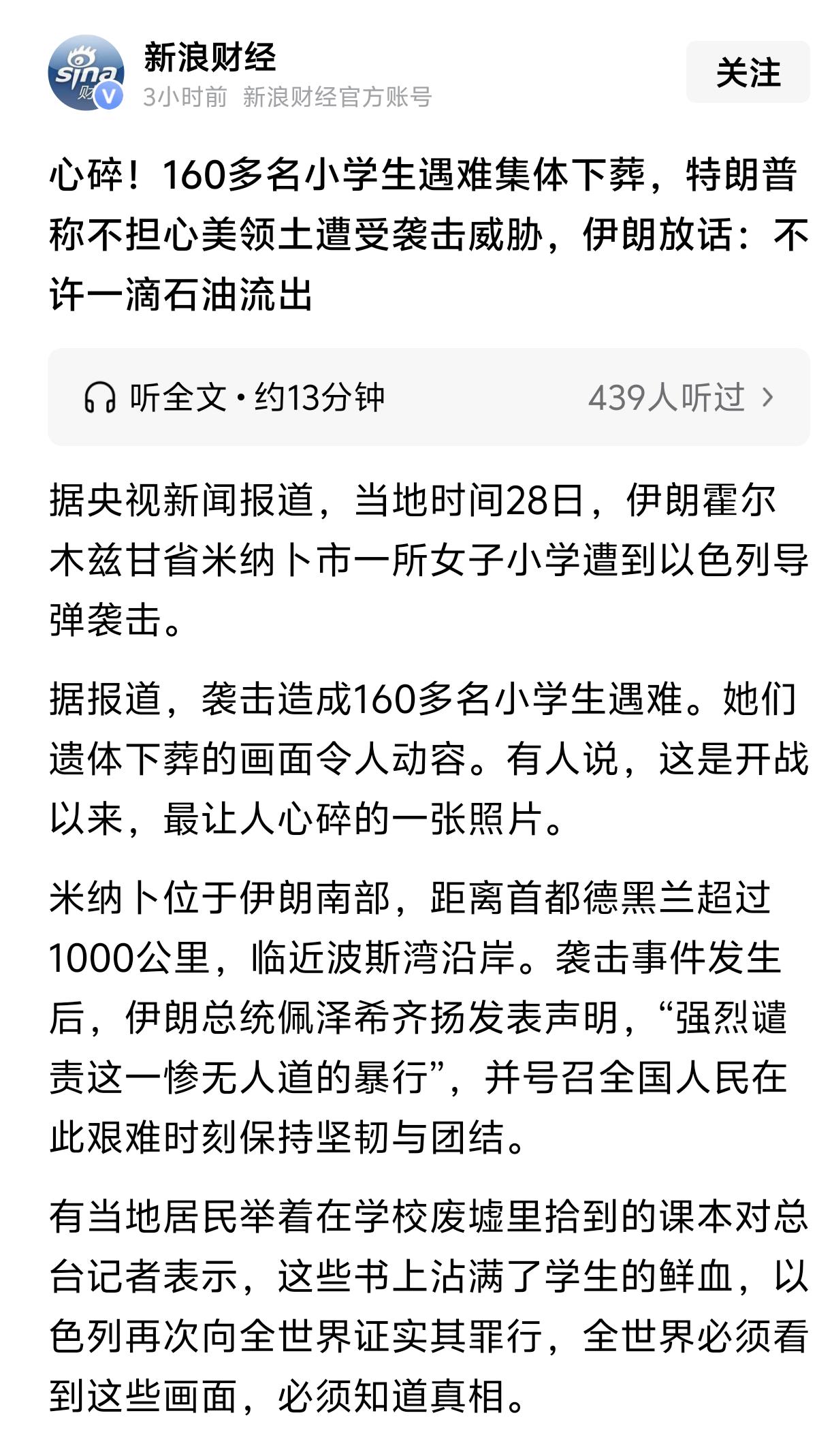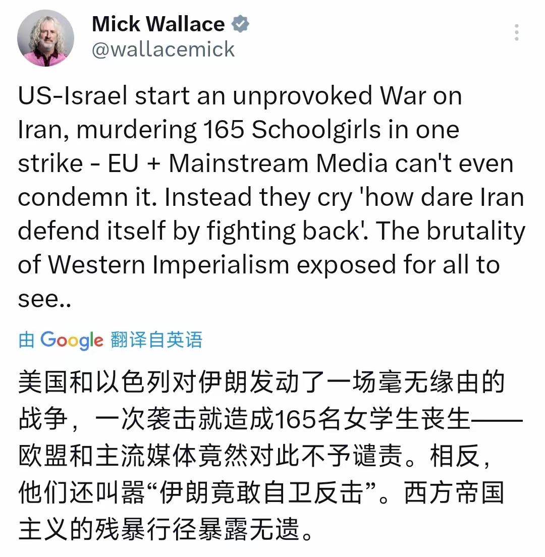 3月3日,欧洲议会前议员华莱士发文称:美国和以色列对伊朗发动了一场毫无缘由的战争,一次袭击就造成165名女学生丧生,欧盟和主流媒体竟然对此不予谴责。相反,他们还叫嚣伊朗竟敢自卫反击。西方帝国主义的残暴行径暴露无遗。 华莱士说的没错,美国和以色列无视国际法准则,发动对伊朗的军事打击,打就打了,却还无缘由的轰炸伊朗学校,造成一百多名师生死亡。有的家长在现场哭诉,称自己的孩子才10岁,却怎么也找不到了。 面对100多名师生死亡,欧盟与主流媒体却没有任何发声,不仅不谴责美国的滥杀无辜行为,反而指责伊朗进行正当防卫,这是何等的冷血,伊朗的学生难道犯了什么错误吗? 美国和以色列的野蛮行径,让本就为弱者的学生付出了代价,然而,一些西方政客却充耳不闻,似乎理所当然,他们装聋作哑,一声不吭。 该议员敢于为弱者发声的做法值得称赞,他解开了西方标榜所谓的人权现状,根本不把妇女儿童放在眼里,是赤裸裸的对人类文明的践踏,那些战争刽子手们难道不会感到不安吗?