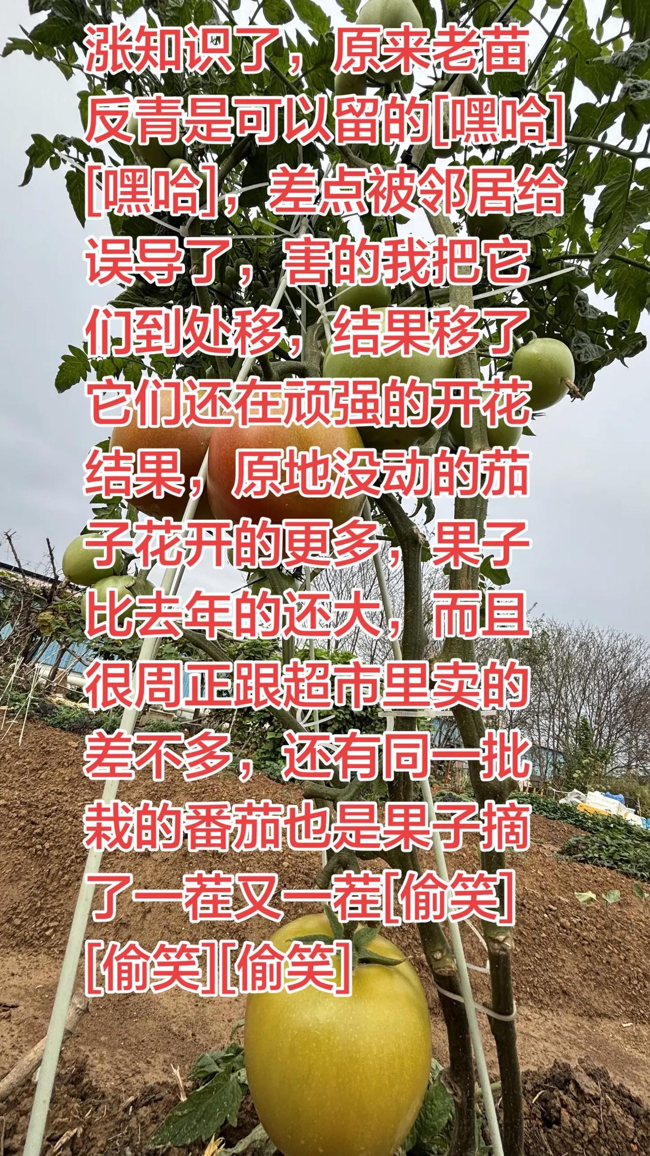 涨知识了,原来老苗反青是可以留的[嘿哈][嘿哈],差点被邻居给误导了,害的我把它们到处移,结果移了它们还在顽强的开花结果,原地没动的茄子花开的更多,果子比去年的还大,而且很周正跟超市里卖的差不多,还有同一批栽的番茄也是果子摘了一茬又一茬[偷笑][偷笑][偷笑]