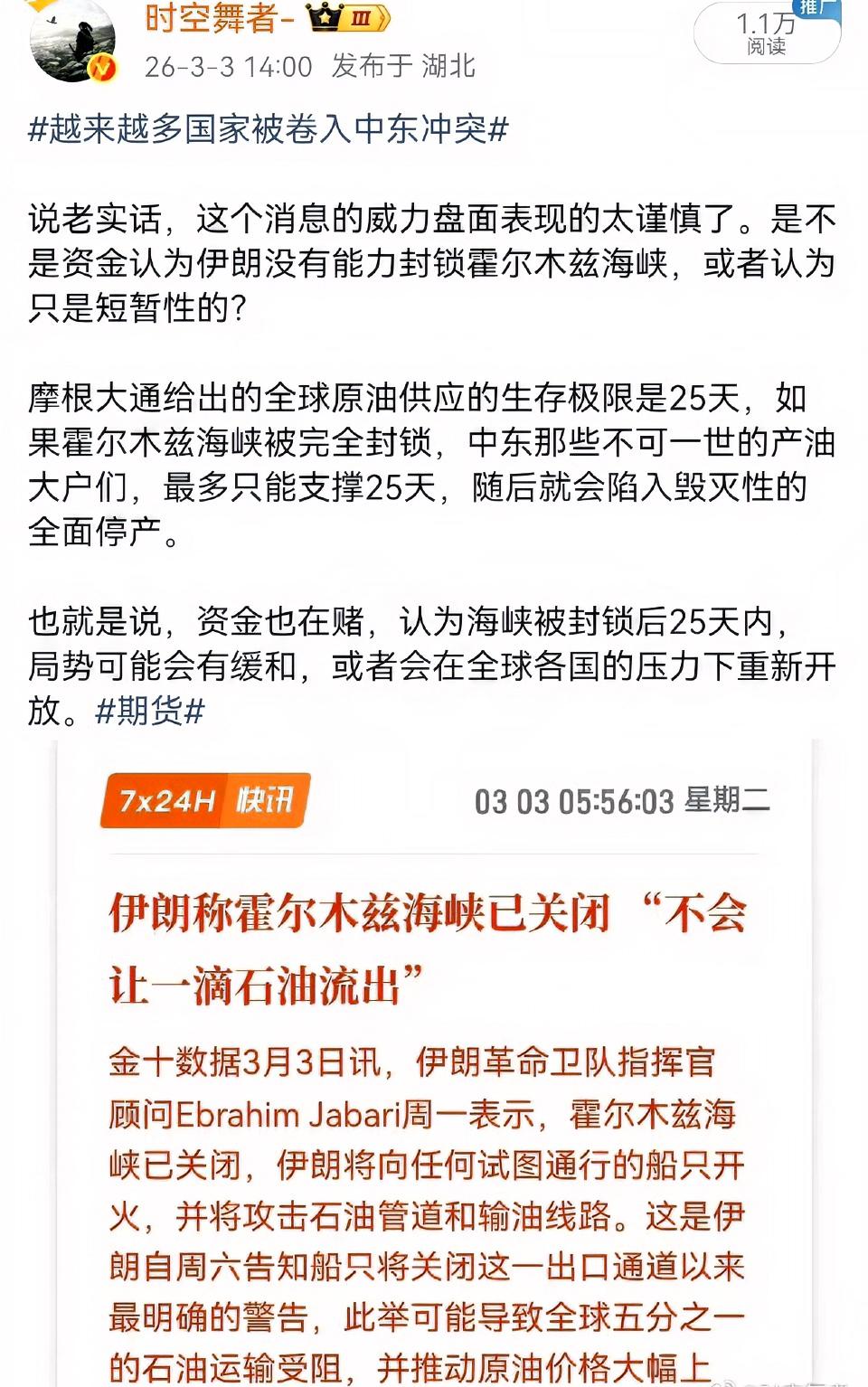 伊朗关闭霍尔木兹海峡这一事件极具冲击力。 2026年2月28日晚,伊朗宣布关闭海峡,瞬间切断了全球约30%的海运石油与20%的液化天然气运输通道。霍尔木兹海峡日均通过约2100万桶原油,一旦封锁,供应缺口极大,远超沙特、阿联酋替代管道的运力。 短期内,布伦特原油单日涨幅可能达40% - 50%;若长期封锁,油价或飙升至150 - 200美元/桶。油价上涨会导致全球通胀急剧上升,航运也将陷入瘫痪。美媒报道称中国向伊朗施压,也是为避免能源货运受到干扰。毕竟能源关乎全球经济,伊朗这一步棋走得大胆,后续影响值得密切关注。