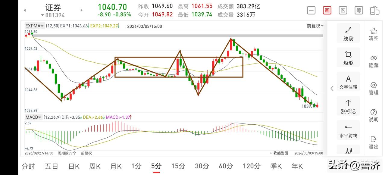 证券板块复盘(2026.3.3) 证券板块今天下午毫无抵抗,下跌力度较强,那么明天只会有弱势反弹,并没有好的操作价值,只能继续等待好的买点出现。 1.从39分钟图一上看,目前正在走第三个中枢的离开段,该离开段还不能判断为结束,因为它还没出现5分钟的中枢,根据走势必完美原则,没有中枢是不可能结束的。 2.从5分钟图二上看,此处有可能会构建一个5分钟的下跌中枢,由于今天市场普跌,那么明天就是一个弱势反弹构建5分钟中枢,此处是没有好的操作价值的,待5分钟中枢构建完成后,再考虑是否操作的问题,目前持股观望即可。 总之,日线一笔调整还没有结束的迹象,预计后面大概率还会构建日线三卖的空头陷阱后才会结束,没办法,只能耐心等了。新年爱好打卡 股票财经