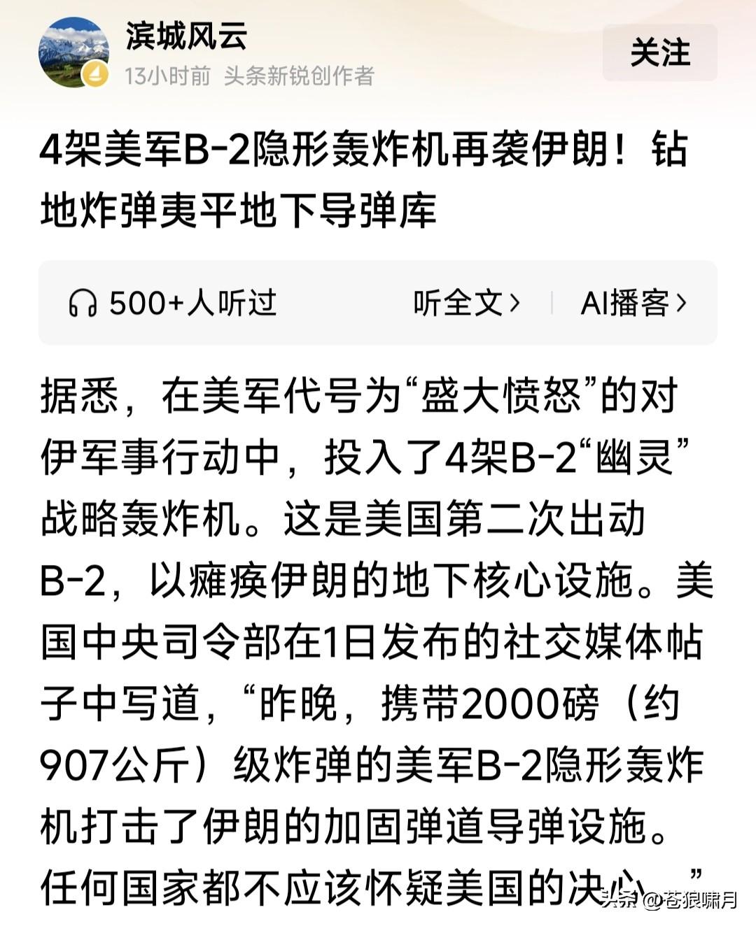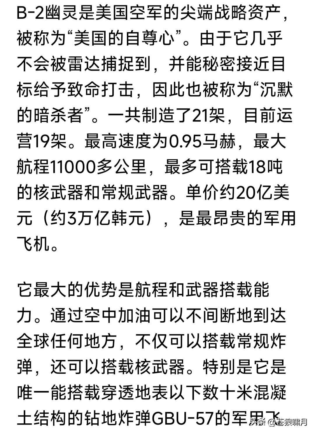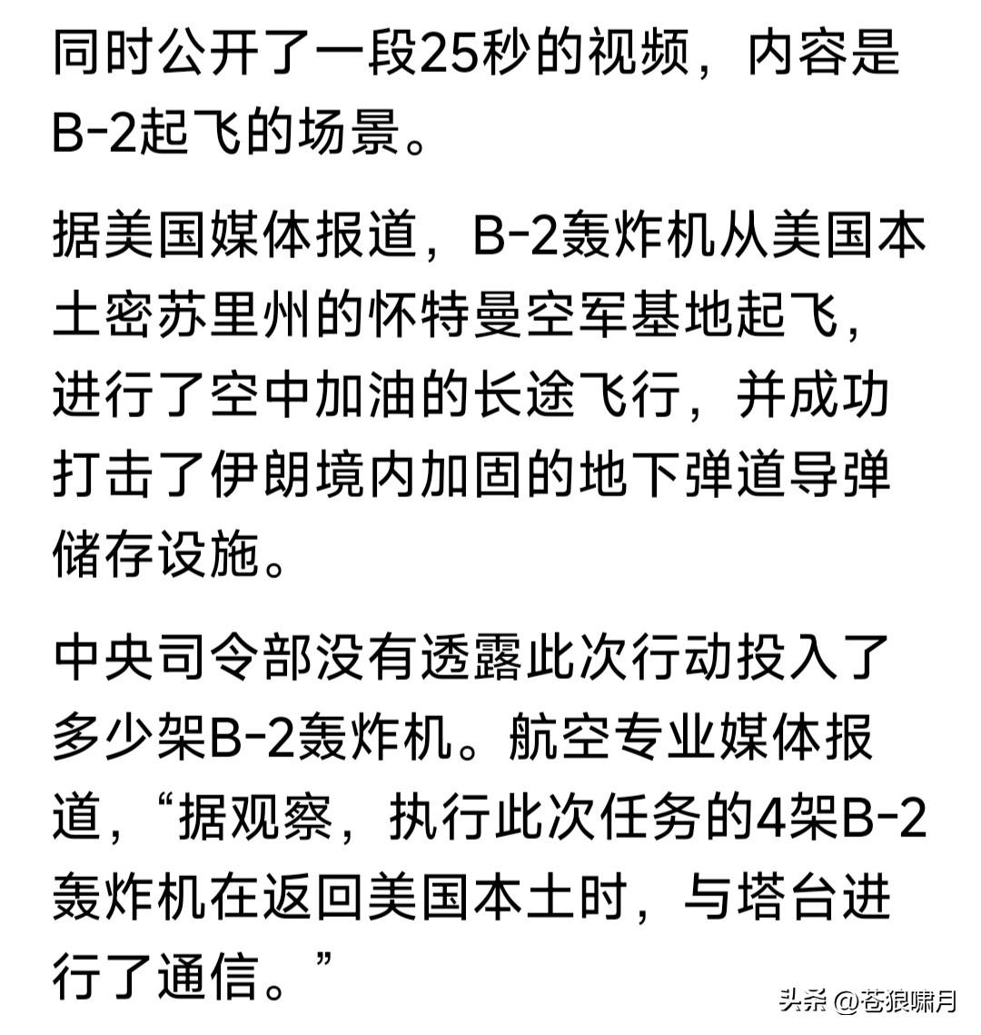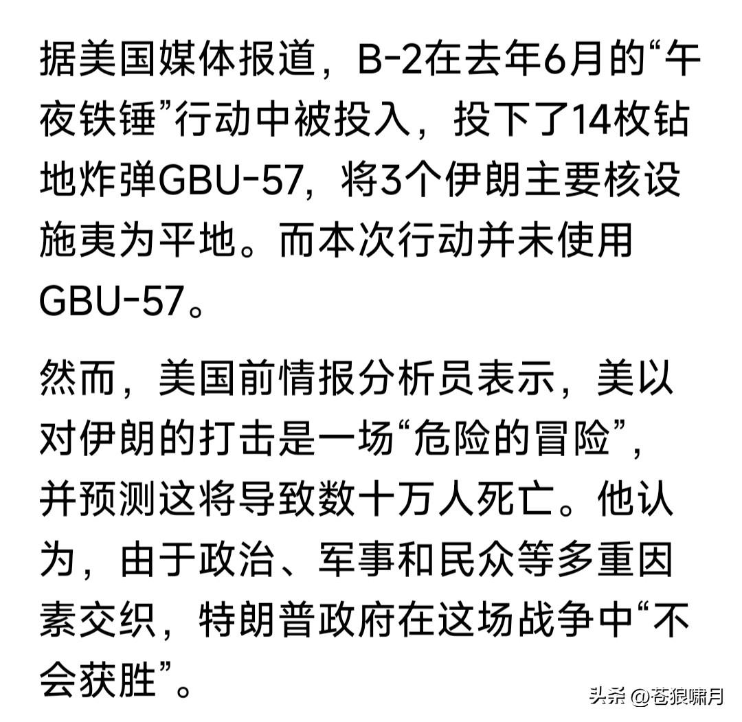 美军“死亡之神”再次出动,长途奔袭轰炸伊朗目标!钻地弹穿透坚固混凝土,连续击中伊朗下导弹储存库,引起剧烈连续爆炸,弹库瞬间夷为平地。 何谓“死亡之神”?美军威力最大的“幽灵猛禽”B-2隐身战略轰炸机!其最厉害之处,是能通过空中加油,长距离穿越超万公里,执行远程轰炸任务。 它能携带导弹炸弹与核弹,载弹量达到20吨左右,最可怕是携带的重磅钻地炸弹,弹头重达近千公斤,可穿透90米混凝土层,直达被攻击目标。 去年6月对伊朗打击中,美军就出动十余架“幽灵”,摧毁伊朗几处核设施。这次由于冲突升级,“幽灵”再次出动,目标目前是伊朗武器库与军工厂。 实话实说,面对美以强力打击,伊朗不畏强权进行反击,展现不屈不挠精神。但面对美以强大军力武器,伊朗反击意义何在?是否会招致更大损失? 最好的办法,是响应安理会呼吁,双方停止冲突,回到谈判桌前,政治手段解决争端!但伊朗会接受美以提出的条件吗?它若不接受,美以答应吗? 现在不说对与错,前有因后有果!何况还有一场战争,已经打了四年,是非对错十分清楚,但却无人制止得了!如此情景之下,谁能管得了美以呢? …………