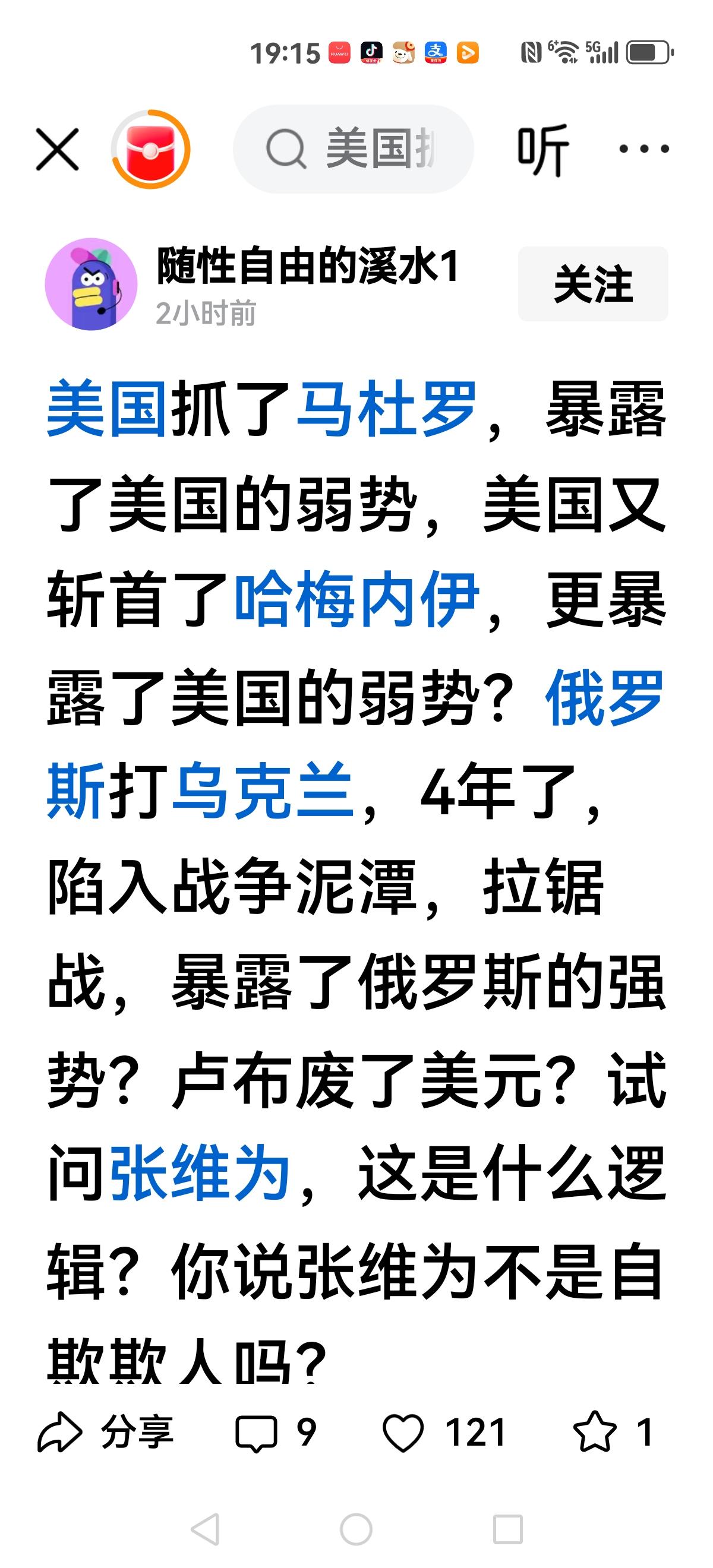 【说你弱,你就弱,不弱也弱】 美国抓了马杜罗,张维为认为弱爆了,不敢从陆地进攻。 以此类推这次伊朗的斩首行动,再次暴露美国软弱无能, 相反俄罗斯四年消耗战,国内经济一塌糊涂,卢布一贬再贬,反而是经济越打越好,卢布一招废除美元。 是不是有点石成金的魔法?