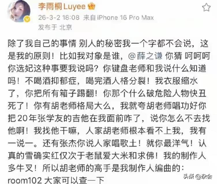 娱乐圈这场风波,谢娜这次发声确实够直接。 张杰这些年专注音乐,低调做人,却屡屡被卷入是非,这次谢娜选择站出来护夫,要的其实就是一句公道话。当年《吐槽大会》那段话,舆论指向性太明显,如今旧事重提,加上李雨桐的爆料,确实让人感慨。 感情纠葛是个人私事,但不该让无辜的人为你的过去买单。支持维护家人,该面对的总要面对。