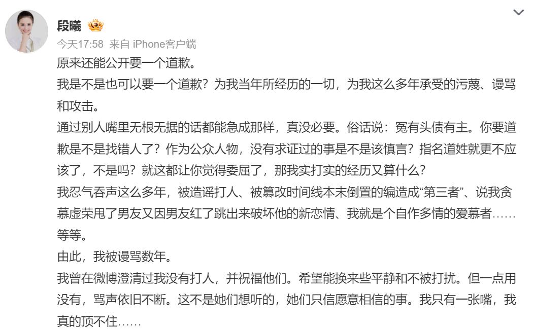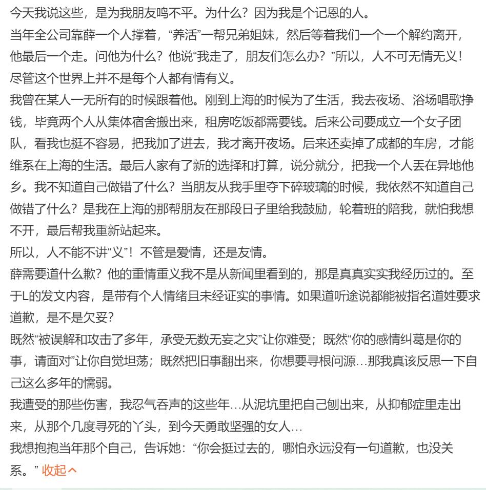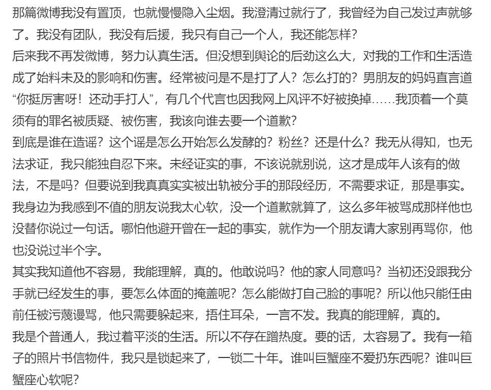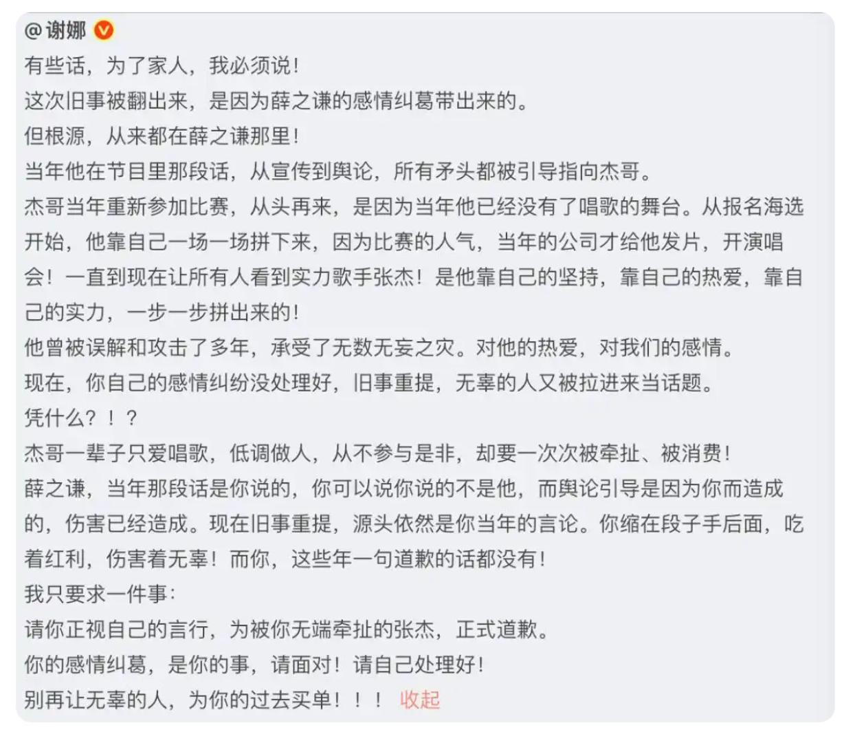 张杰前女友发声,现在轮到谢娜尴尬了。 薛之谦这事,谢娜本来就可以选择不出声的,但她可能觉得张杰太不容易,忍不住想要为张杰讨要一个说法,一个道歉。 道歉还没讨到,张杰女友先出来发声了,称如果张杰都来要道歉,谁来给她一个道歉。 段曦的长文主要有五点: 一、她和张杰恋爱中,卖房支持张杰的事业。 二、张杰无缝衔接,她被分手; 三、这些年一直饱受谣言困扰,张杰从来没有站出来说一句话; 四、她从来没有打人。 五、她站队薛之谦,因为他曾帮过她。 从全文看,段曦字词冷静克制不带情绪,只是讲清事实没有任何蹭热度的嫌疑,结合薛之谦此前在节目中的吐槽,让她的这些说法好像更接近事实,也更令人信服。 这出效果,可能是谢娜没有想到的,原本只是想墙倒众人推时分一杯羹,没想到却惹来一身 骚。 段曦的小作文是否全部属实,还未可知,如果她能拿出实打实的证据,晒出那一堆照片和信物,张杰的口碑肯定会受到很大的影响。 目前,张杰和谢娜均还未发声。
