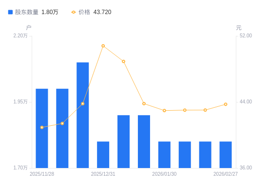 日期A股户数(户)流通A股户均持股数(股)户均持股市值(万元)2026-02-27180007620.2233.322026-02-13180007620.2232.782026-02-10180007620.2232.772026-01-30180007620.2232.742026-01-20190007219.1531.622026-01-09190007219.1535.312025-12-31180007620.2238.712025-12-19210006531.6228.602025-12-10200006858.2028.392025-11-28200006858.2028.06