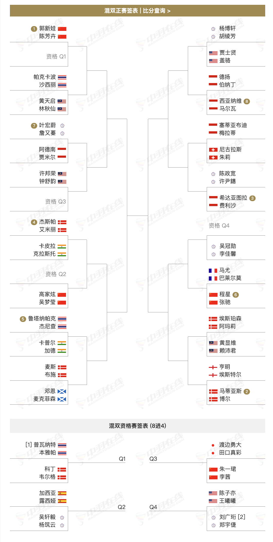 混双:郭新娃/陈芳卉🇨🇳 vs Q1程星/张驰🇨🇳 vs 🇫🇷马尤/巴莱尔莫高家炫/吴梦莹🇨🇳 vs Q2朱一珺/李茜🇨🇳 vs 🇯🇵渡边勇大/田口真彩(资格赛)中国羽毛球队