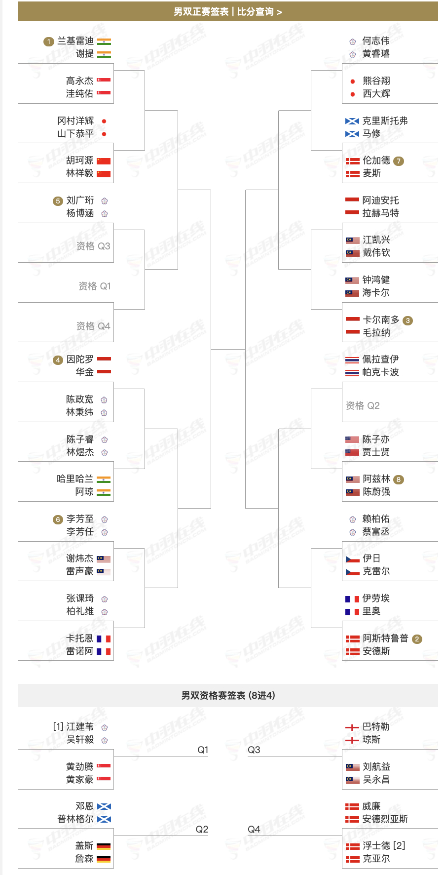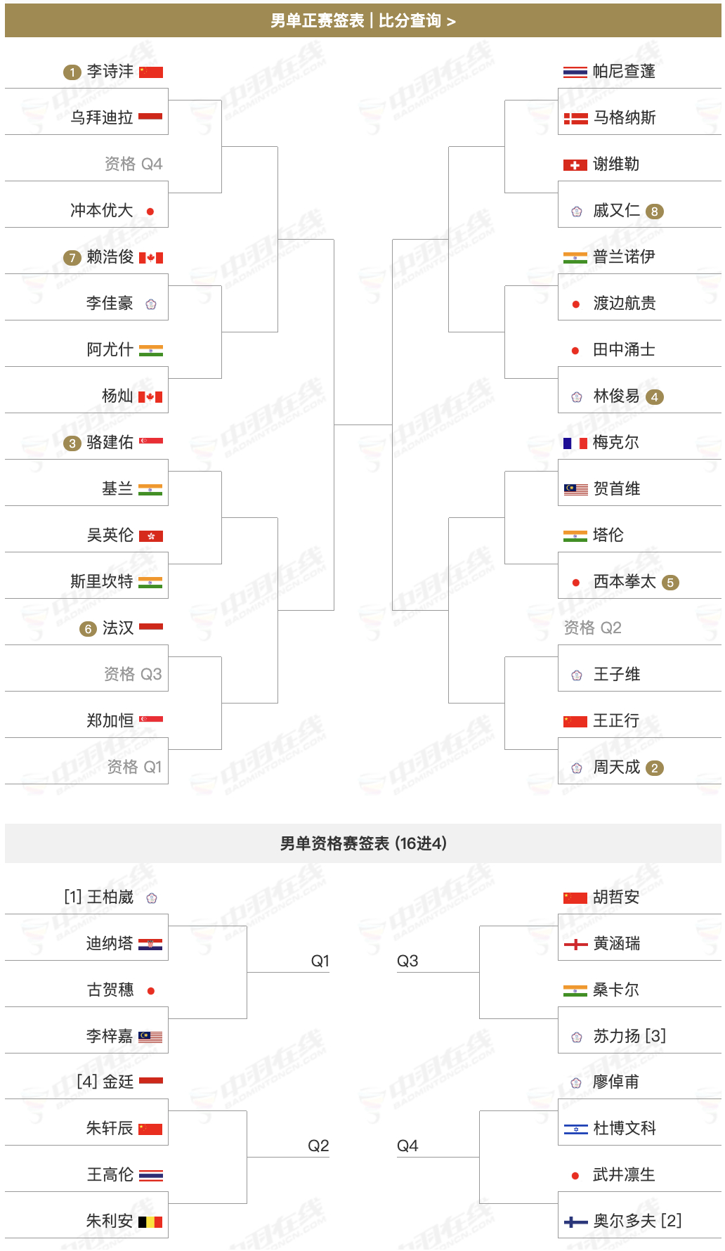 男单:李诗沣🇨🇳 vs 🇮🇩乌拜迪拉王正行🇨🇳 vs 周天成朱轩辰🇨🇳 vs 🇮🇩金廷(资格赛)胡哲安🇨🇳 vs 🏴黄涵瑞(资格赛)