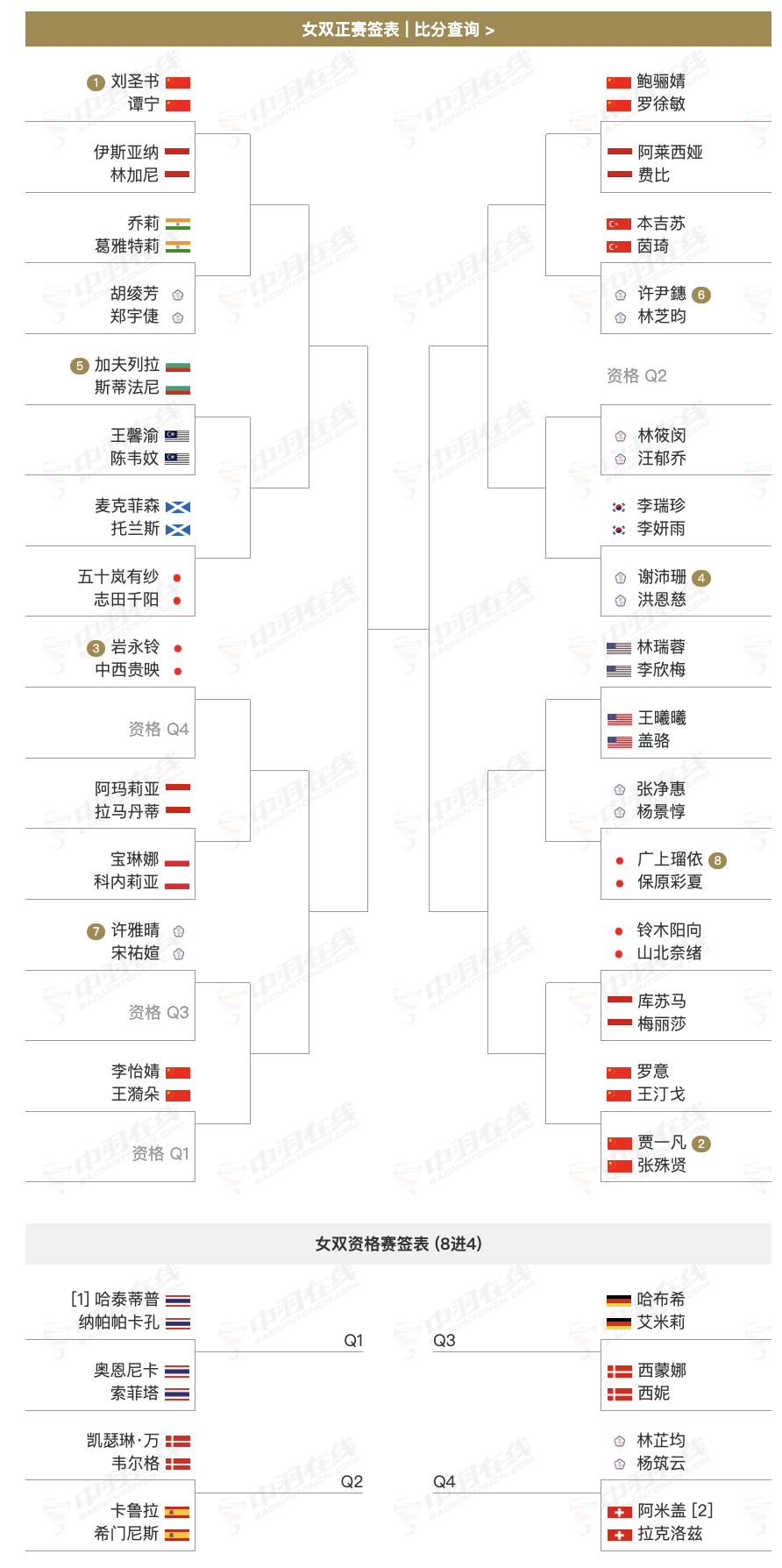 女双:刘圣书/谭宁🇨🇳 vs 🇮🇩伊斯亚纳/林加尼贾一凡/张殊贤🇨🇳 vs 🇨🇳罗意/王汀戈李怡婧/王漪朵🇨🇳 vs Q1鲍骊婧/罗徐敏🇨🇳 vs 🇮🇩阿莱西娅/费比