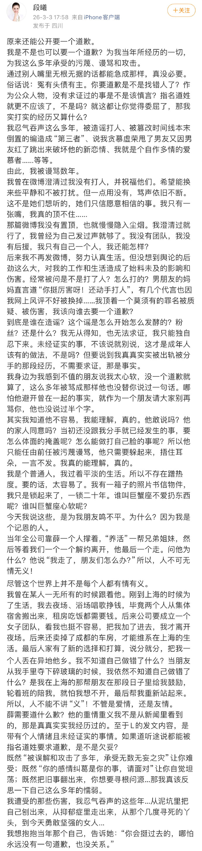 1、明确否认全网流传的“掌掴谢娜”传闻,强调从未实施任何暴力行为,并曾早年发文澄清。2、指控有人故意颠倒事实时序,将其在恋爱关系存续期内的正当身份篡改为“插足他人感情的第三者”。真实情况是,张杰在尚未与其正式分手时已与他人发展关系,自己反被塑造成破坏者。3、驳斥“因张杰事业低谷主动分手,待其走红后又回头纠缠”的传言。段曦称曾在男方事业低谷时打工维系生计(夜场驻唱、变卖成都车房),最终却遭“因名利抛弃男友”的污名化。4、段曦指出,尽管手握照片书信等证据但从未炒作,而张杰十余年来从未以朋友身份公开劝阻网络暴力,也未澄清事实关系。她理解对方“为维持体面而沉默”,但强调这种放任实质助长了谣言。5、段曦暗指谢娜作为公众人物“未核实真相即公开点名要求道歉”的行为欠妥,反衬自身遭遇的慎言缺失。她并向谢娜发出质问:“你要薛之谦给张杰道歉,那我呢?这18年来,谁来向我道歉?”