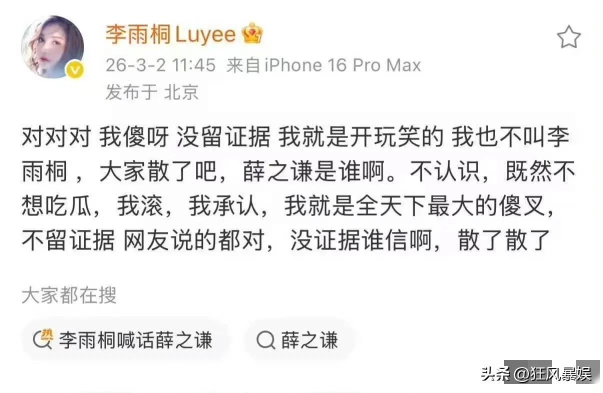 薛之谦,给所有人提了个醒! 3月3日,薛之谦突然登顶热搜,不是因为他的演唱会,也不是因为他又有新作品,而是因为李雨桐的喊话,网友纷纷直呼:啥情况? 李雨桐也不知道受了什么刺激,突然在网上喊话薛之谦,要求归还手表和西装,还说要联合高磊鑫揭露薛之谦的丑恶嘴脸。但是令人没想到的是,2个小时后,李雨桐又说,没有证据,跟大家开个玩笑。 这前言不搭后语的,看的大家一脸懵,纷纷表示:“已经分手十年了,就不能放过彼此吗?”“这样真的好吗?”“只能说薛之谦遇人不淑吧!” 他们之间到底发生过什么,咱也不知道。不过42岁的薛之谦倒是给所有人提了个醒,你可以谈恋爱,也可以分手,但一定要找个情绪稳定的,不然,就会像李雨桐一样,时不时给你闹一下子。
