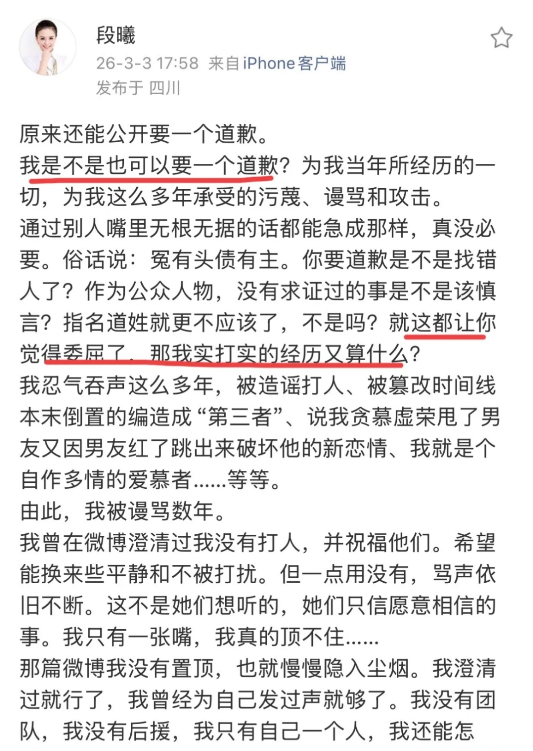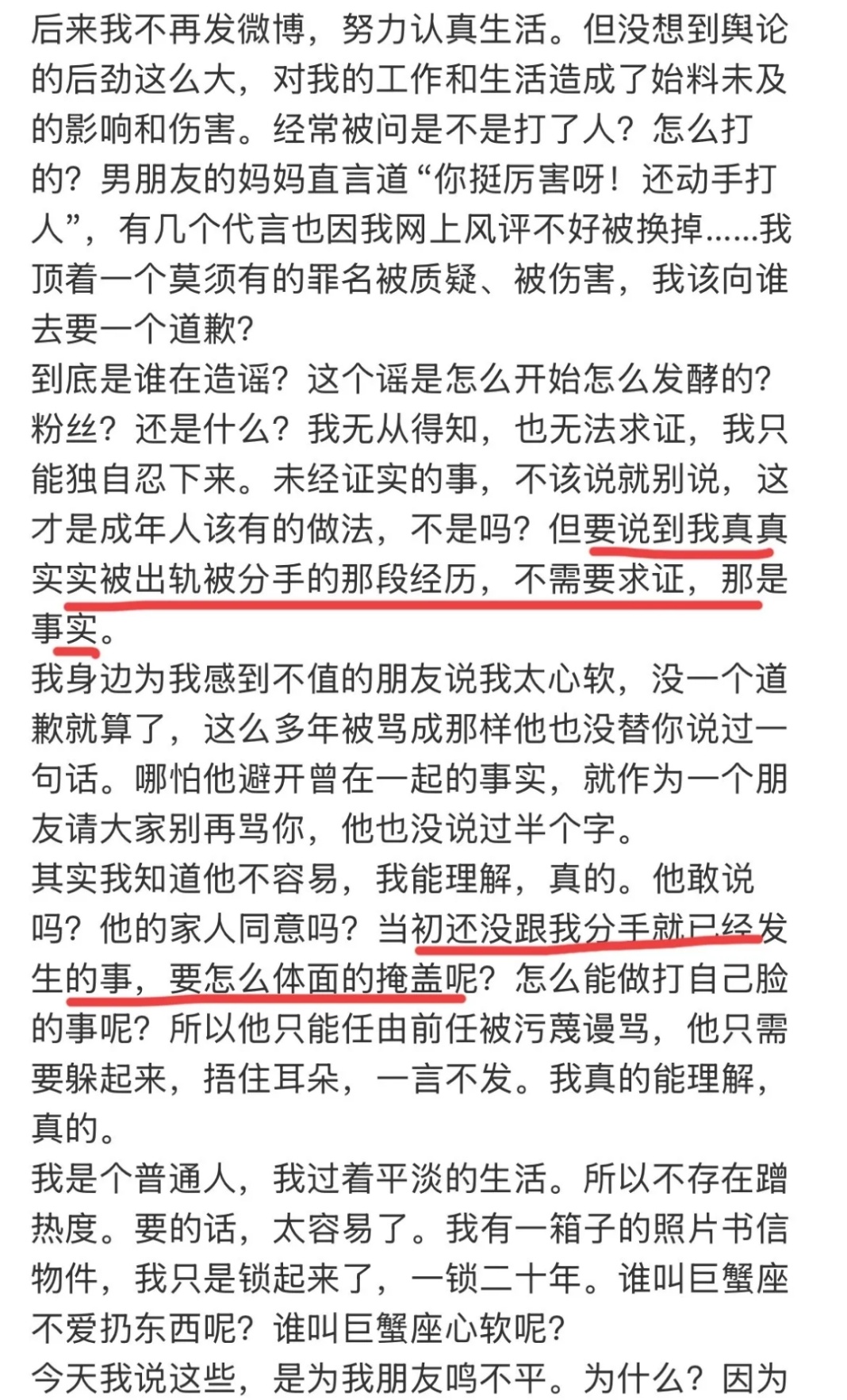 更冤的是掌掴谢娜的谣言传了十几年,代言丢了、生活被搅烂,张杰谢娜从来没替她澄清过一句。这次看来真的只是为了讨一个公道,被出轨是事实,被辜负是事实,被造谣也是事实。