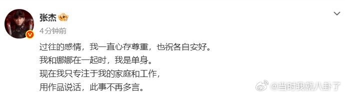张杰回应 张杰正式回应,称对过往感情尊重祝福。同时强调,和谢娜在一起时自己是单身,如今专注家庭和工作上,后续会用作品说话,并不再对此事多言!张杰称和谢娜交往时单身张杰