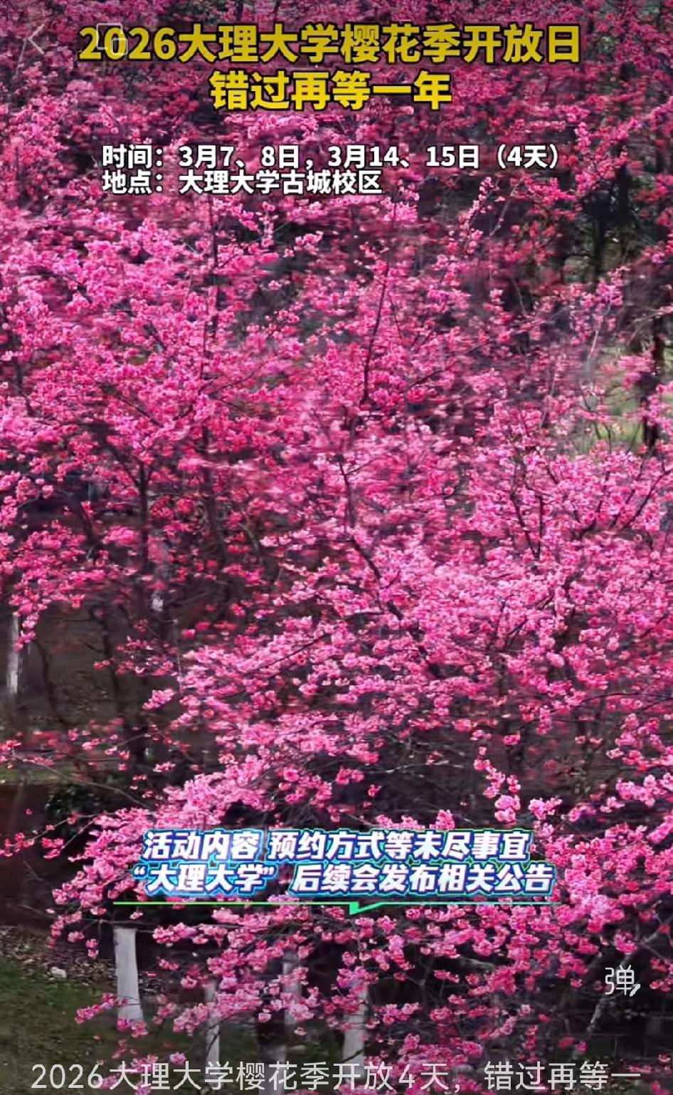 🌸🌸🌸大理大学官宣:赏樱佳期,开放四天! 大理大学关于举办第八届开放日的公告(一) 🥀🥀🥀赴一场樱花之约,圆一段青春之梦。 长久以来,大理大学始终秉持“立足大理,服务滇西,面向云南及周边省区,辐射南亚东南亚”的服务定位,办学成效持续凸显,办学特色愈发鲜明。 为回报广大人民群众和社会各界对大理大学的关怀与支持,让更多人了解大理大学,共享学校发展成果,经学校研究决定,举办大理大学第八届开放日活动。 🎋🎋🎋主 题 开放赋能 暖心同行 ⏰时 间 2026年3月7、8日,3月14、15日,共计4天 活动内容、预约方式等未尽事宜,请关注后续发布的公告。