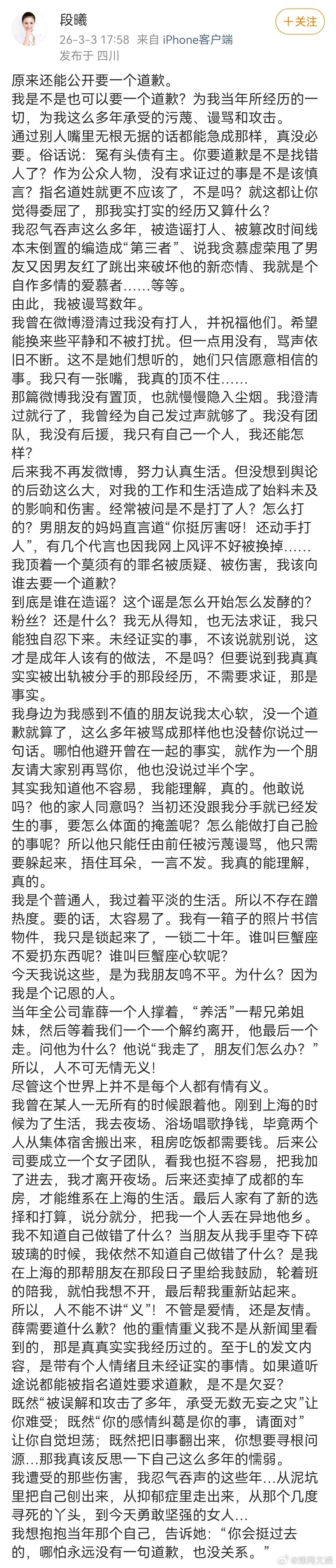 稍早前,张杰前女友段曦发长文,称自己和张杰在一起时被出轨被分手。