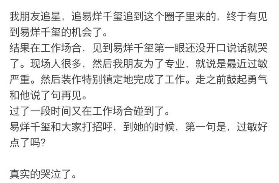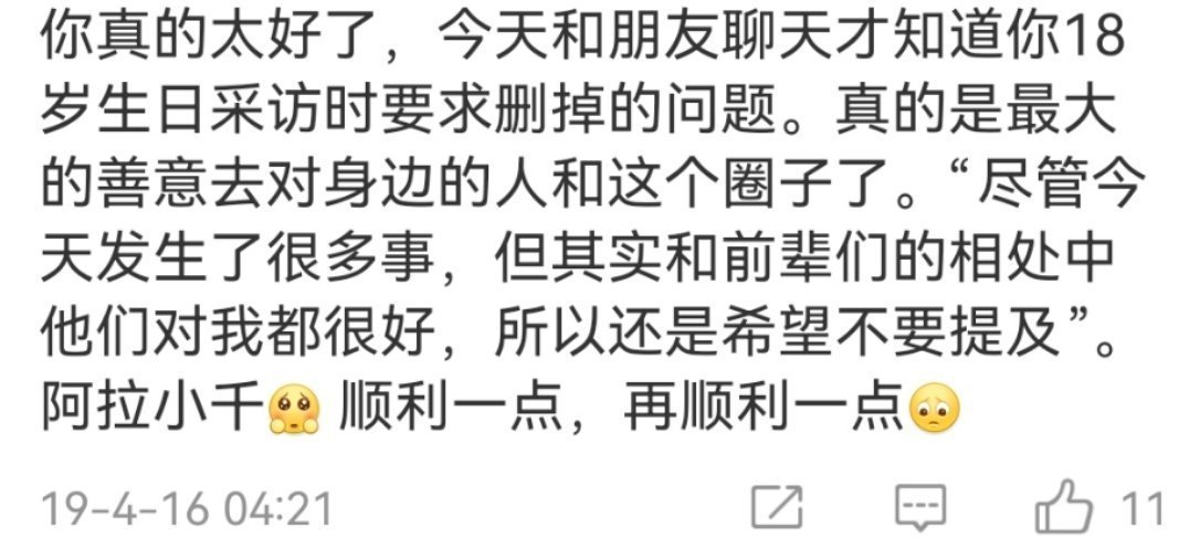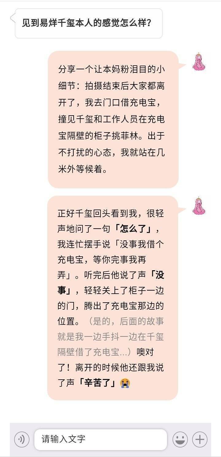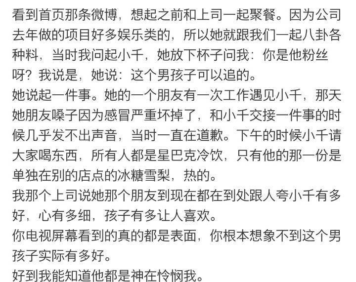 会轻轻用纸巾包住受伤的蝴蝶,会捡起舞台上的糖果,会给小朋友最大的鼓励支持,会记得过敏的工作人员会在点饮料的时候照顾到感冒的工作人员,会腾出位置让等待的人借充电宝,会在成人礼大家兵荒马乱想吃瓜的时候删掉采访里关于其他人的问题。我们小千一直都是是全世界最好的小千