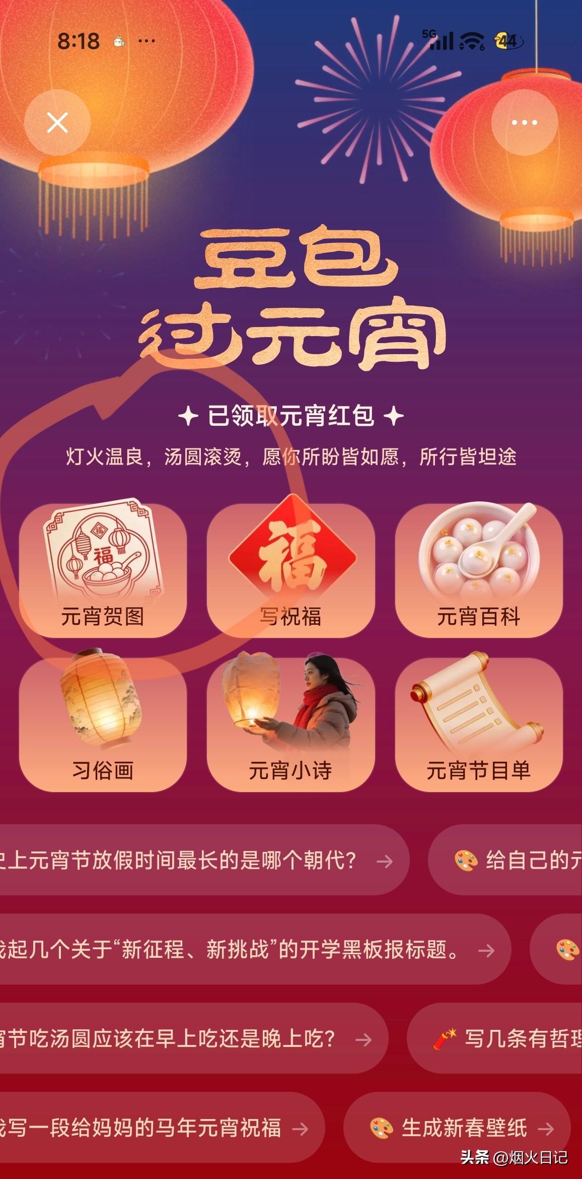 快来豆包领红包 今天是元宵节,豆包又在发红包。 马上点开豆包,看到下面有一个豆包元宵,点开之后会出现一些界面(如下图三),之后随便点开一个(我点的是第一个),点开之后,接下来就是豆包自动生成,过后豆包就会给你发红包。每个人都有,赶紧去试试吧! 不过红包暂时还不能提现,要等到3月4日6点以后就可以提现了。还没有领的家人赶紧去试试吧,毕竟这也是一顿早餐钱! 豆包互动 豆包新年照 豆包微信 豆包过年攻略 豆包中奖 豆包红包攻略 包好玩的小豆包 豆包收费