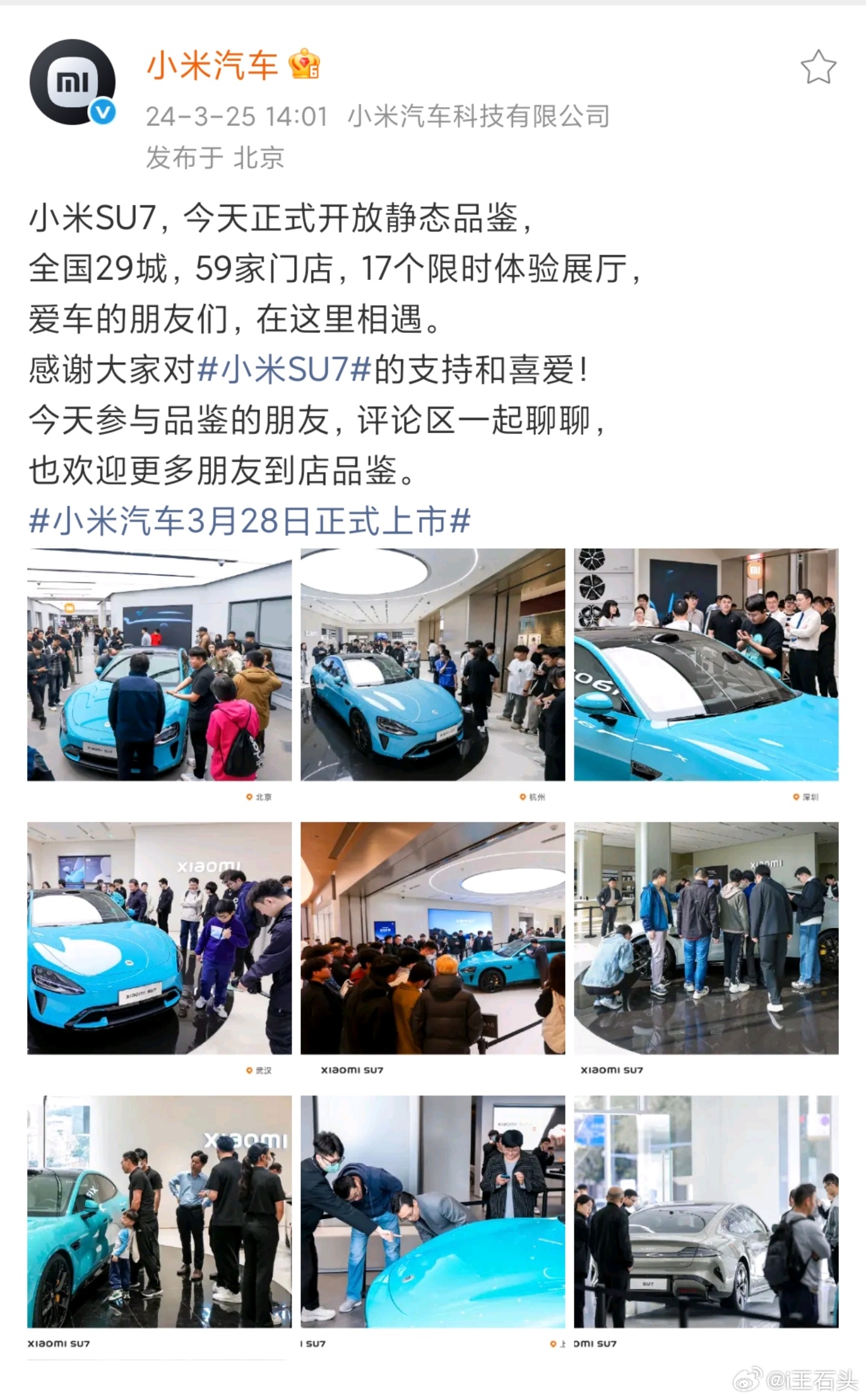 回想2024年3月,同样是新车发布前夕,那时的初代SU7开启静态品鉴时,全国仅覆盖29城、59家门店和17个限时体验展厅。