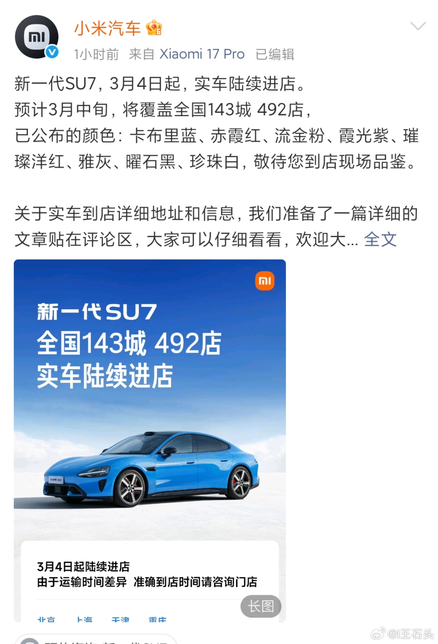 刚刚看到小米汽车官宣,新一代SU7 将于3月4日起,实车陆续进店。官方表示,3月中旬实车将覆盖全国143座城市的492家门店。