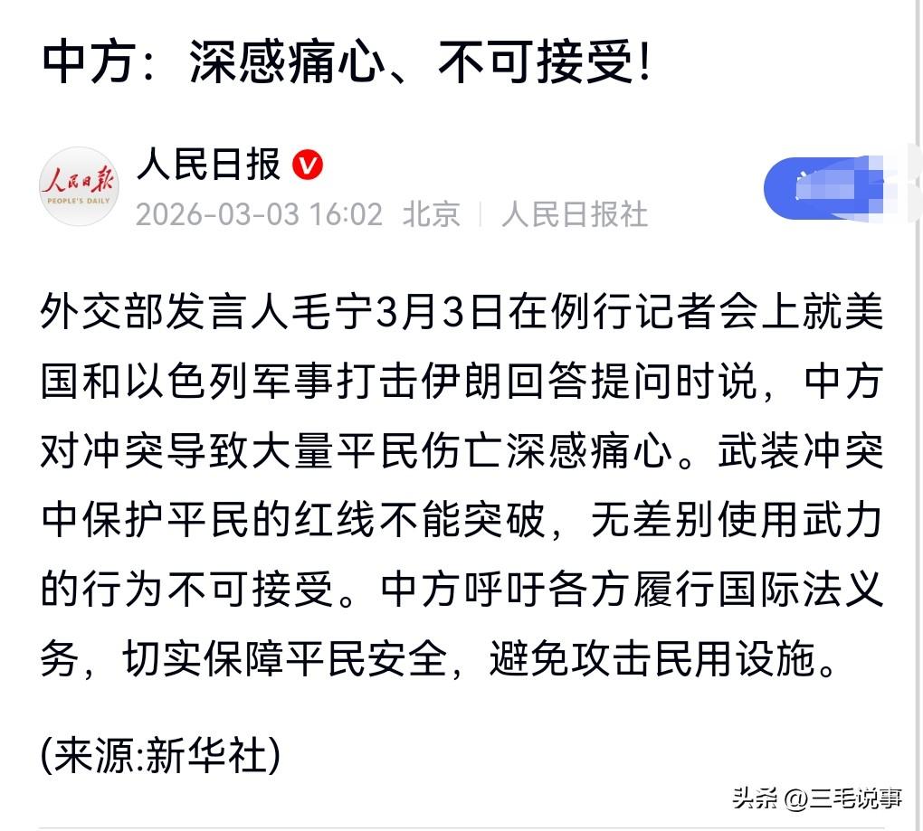 确实让人非常的痛心。 对于此前伊朗一女子小学被炸死了100多个小学女生,以及大量平民被炸身亡。 3月3日热搜,中方:对冲突致大量平民伤亡深感痛心。 这说明美国和以色列是毫无底线的存在,和当年的日本人以及德国纳粹没什么两样。 保护平民的底线不能突破。
