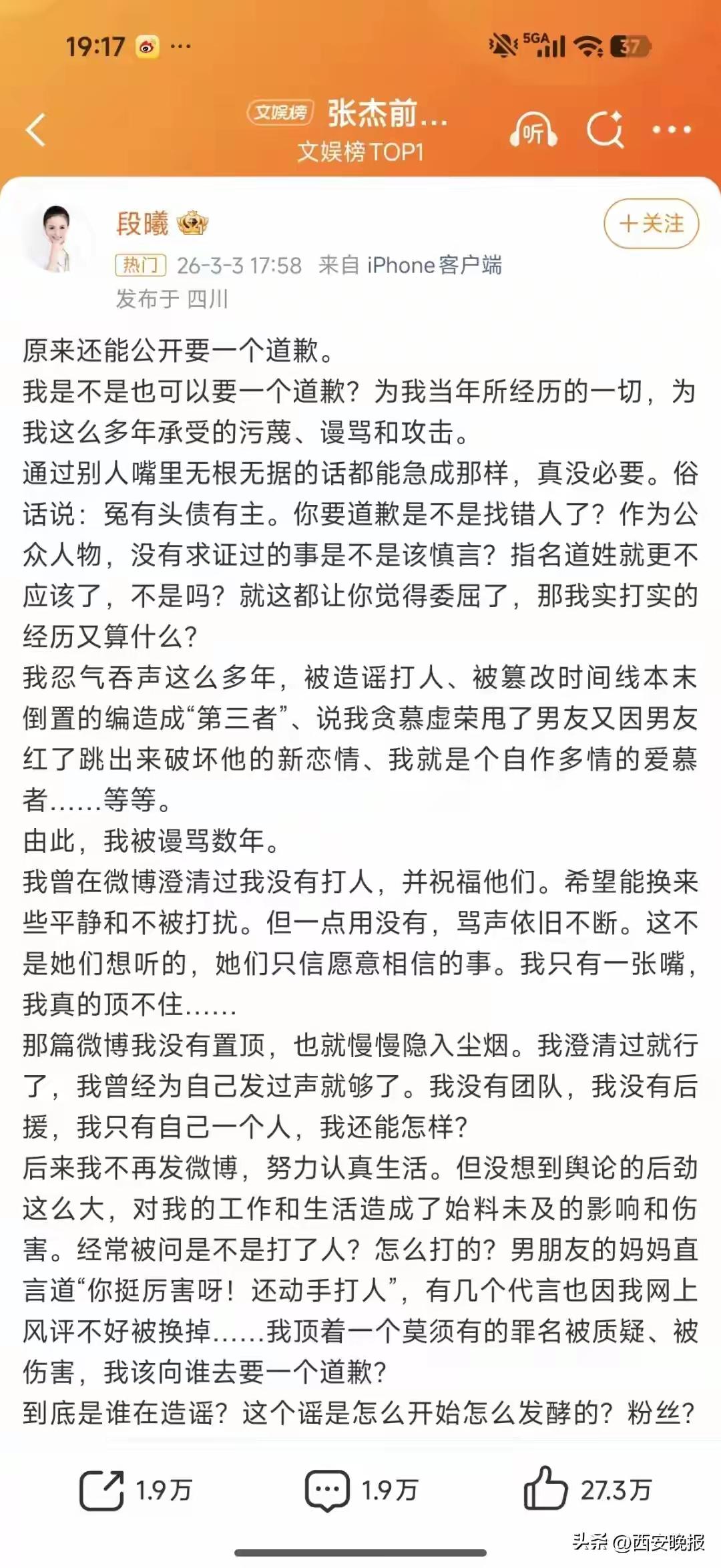 娱乐圈的事有时候觉得真是一团乱麻 ,的确有点剪不断理还乱的味道。 本来是谢娜喊话薛之谦 ,让其道歉 ,要为老公张杰讨个说法。没想到,半路上杀出个程咬金。 对谢娜的咄咄逼人 ,当事人薛之谦没有来得及回应,倒是段曦急着发长文表态,要支持薛之谦。 而这段曦何许人也?她不是别人,是张杰的前女友 。敢在在这个时间节点发长文, 显然是有意为之。 之前,段曦一直坚称自己是情感的受害者,自己当年“被出轨”是“无需求证的事实”。 你看这事闹的,一波未平一波又起。本来有谢娜出面喊话,张杰没吭声,现在这架势,不开口说几句估计都不行了。 面对段曦的千字长文,张杰本想置之不理,但事已至此,已经无法继续保持沉默了,只好硬着头皮进行回应。 反正娱乐圈的恩恩怨怨、是是非非,我是无论如如何也看不明白,也不想看明白,估计也没有几个人能看明白。