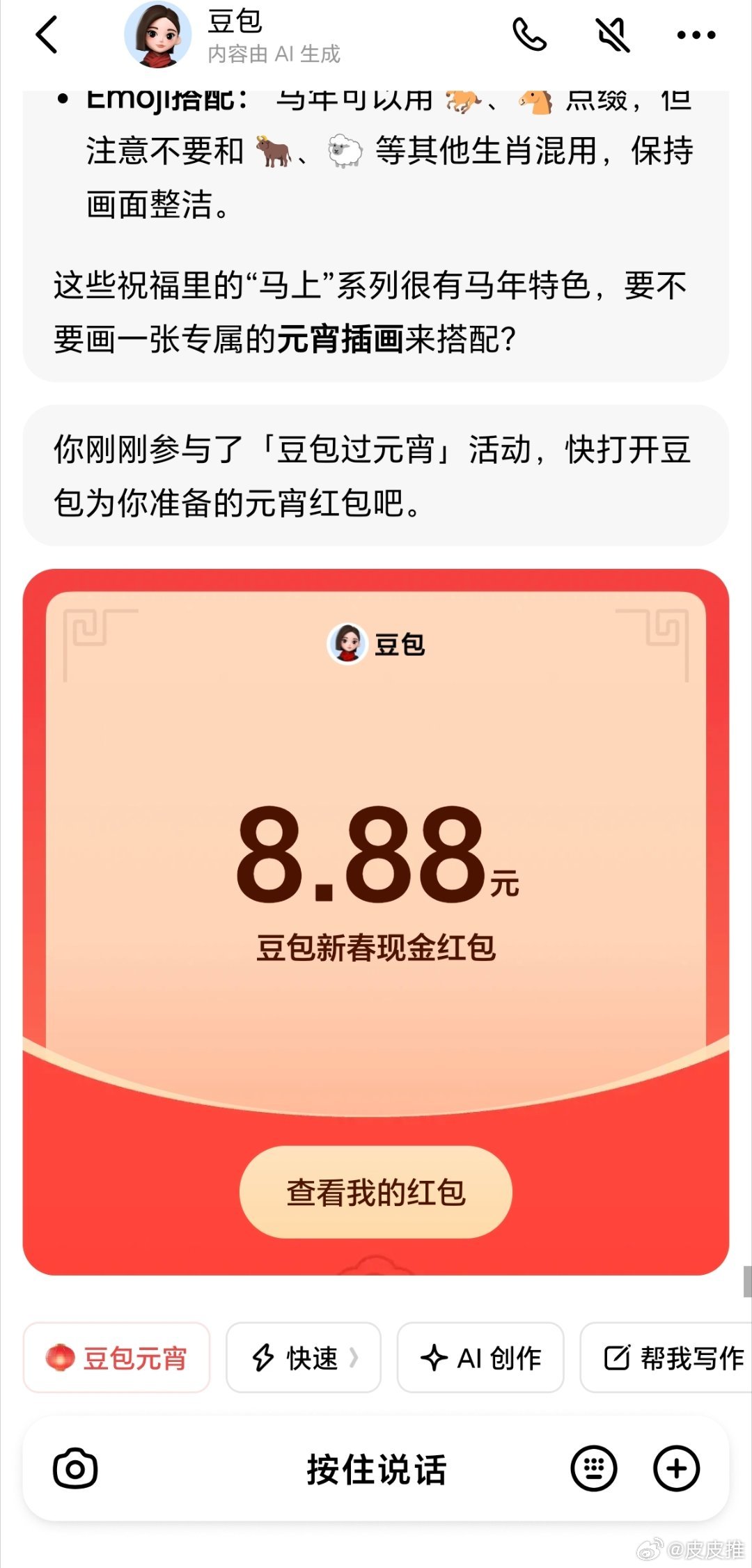豆包元宵节的红包还挺大,我刚抢了8.88元,大家抢了多少呀?豆包红包科技先锋官