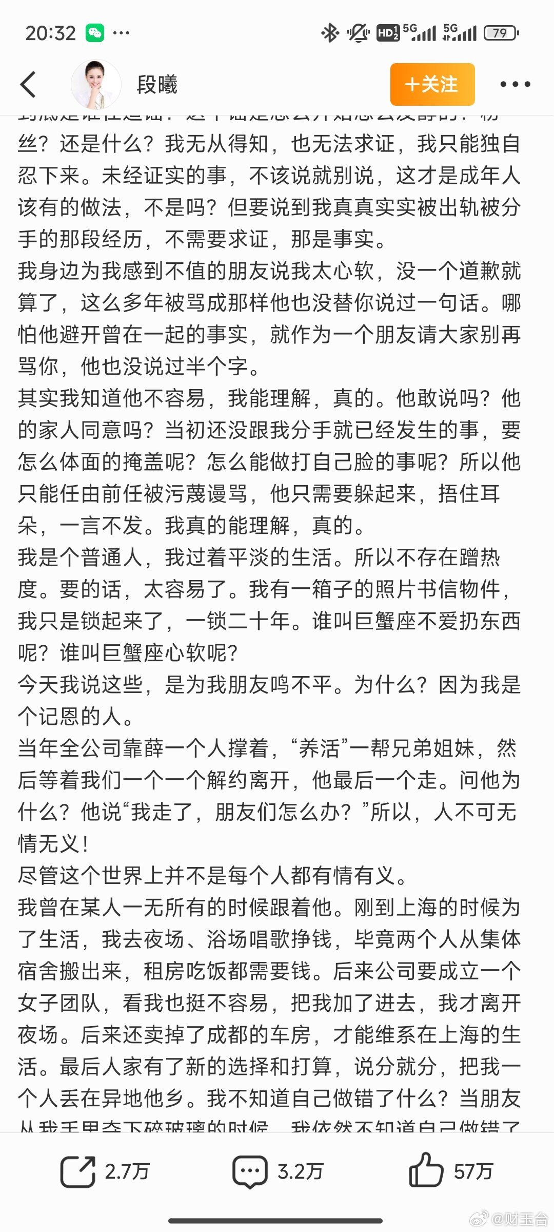 张杰前女友 被出轨是事实 这场翻涌的旧账,终究成了各执一词的罗生门。段曦的千字长文,字字是二十年的委屈:卖房卖车陪张杰走过低谷,却在未正式分手时被“抛弃”,抑郁到轻生,还背了十几年“掌掴谢娜”的黑锅,代言尽失、亲友误解。她直言“被出轨是事实”,要的不过是一句迟来的道歉,也因薛之谦当年的照拂选择力挺对方。而张杰的回应干脆利落:尊重过往,祝各自安好,核心一句“我和娜娜在一起时,我是单身”,划清界限,不再多言 。争议的核心始终在时间线的对撞——2006年何炅牵线张杰谢娜相识,2007年张杰参加快男与段曦分手,这段重叠期成了谜团 。有人翻出段曦过往点赞夸张杰的微博质疑态度反复,也有人心疼她被网暴多年无人澄清 。说到底,娱乐圈的情感旧账难有绝对真相。我们能看见的,是段曦为自己正名的勇气,是张杰守护家庭的立场,也是网络暴力对个体长达十余年的侵蚀。是非曲直或许难断,但希望这场风波能止于真相,而非无休止的站队与谩骂。