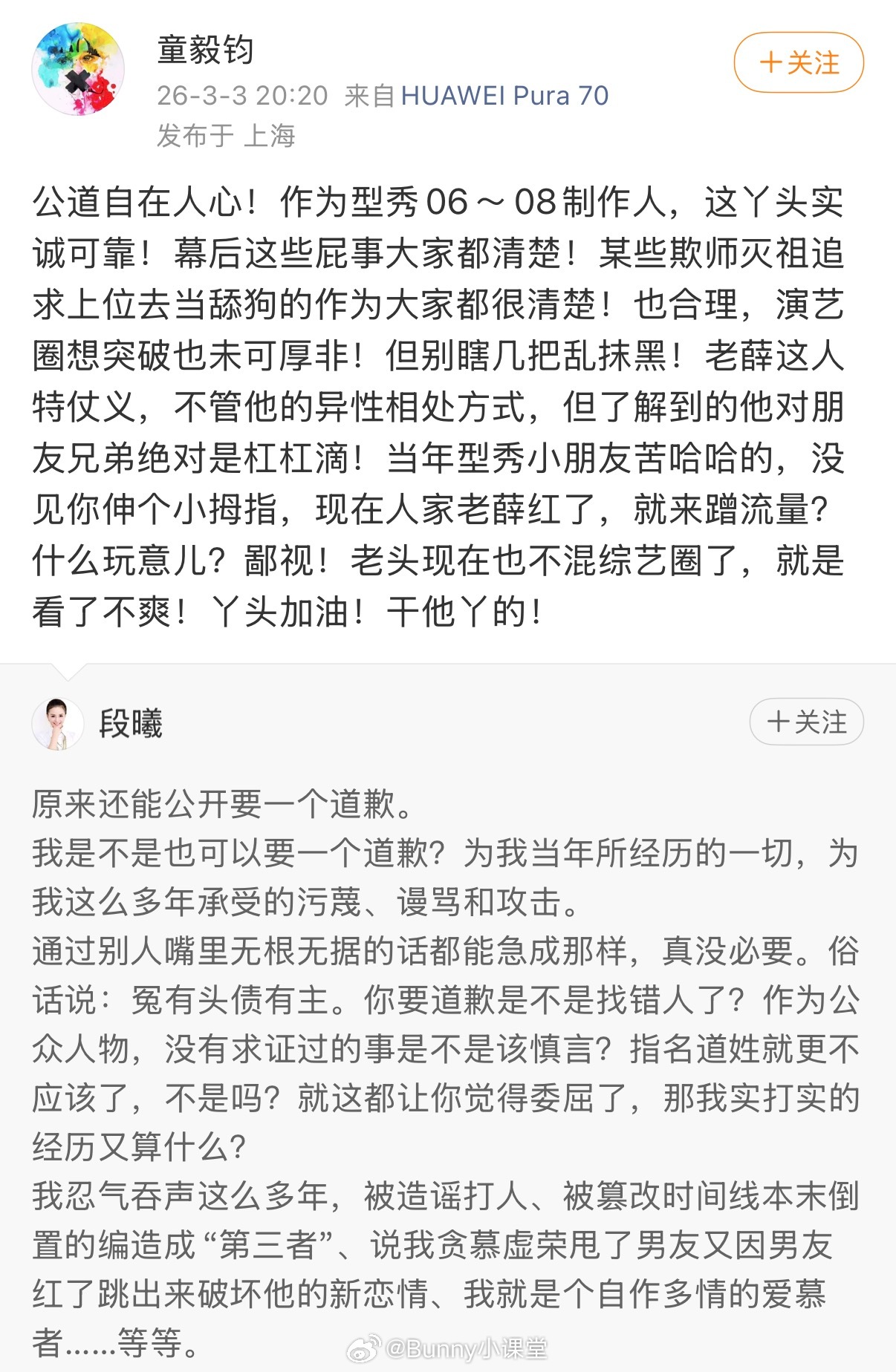张杰前助理吐槽谢娜张杰,张杰前经纪人则表示薛之谦人很好,够义气!刚刚我型我秀型前制作人童毅钧转发段曦,称幕后那些事大家都清楚,某些欺师灭祖追求上位去当舔狗的作为大家都很清楚,力挺薛之谦!