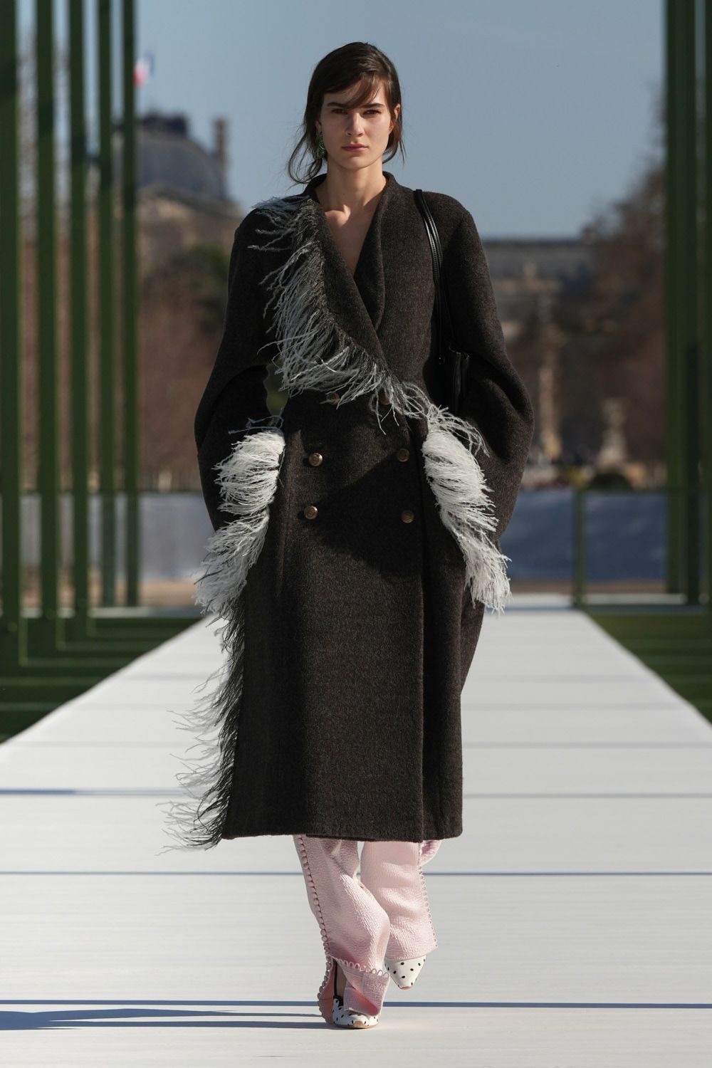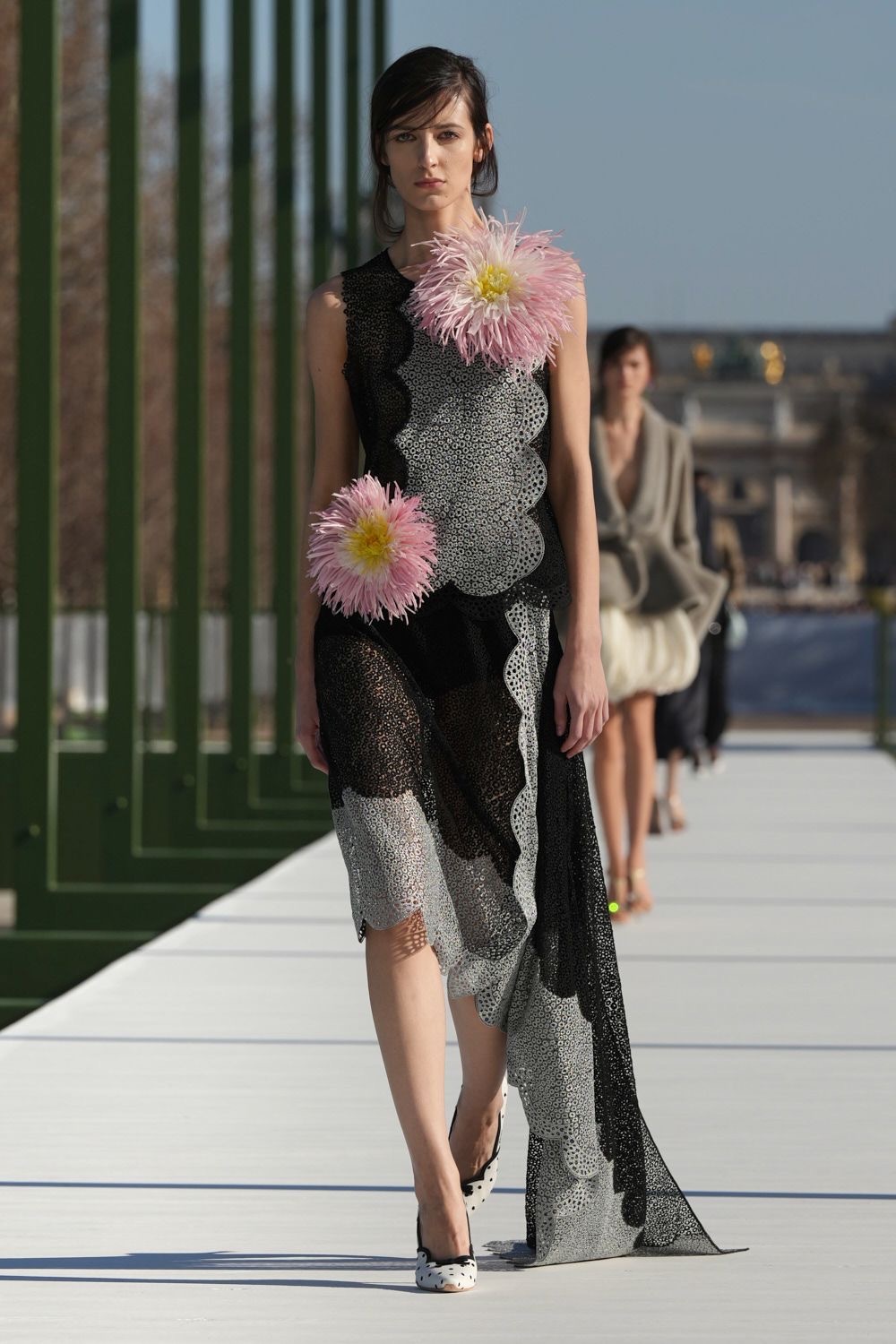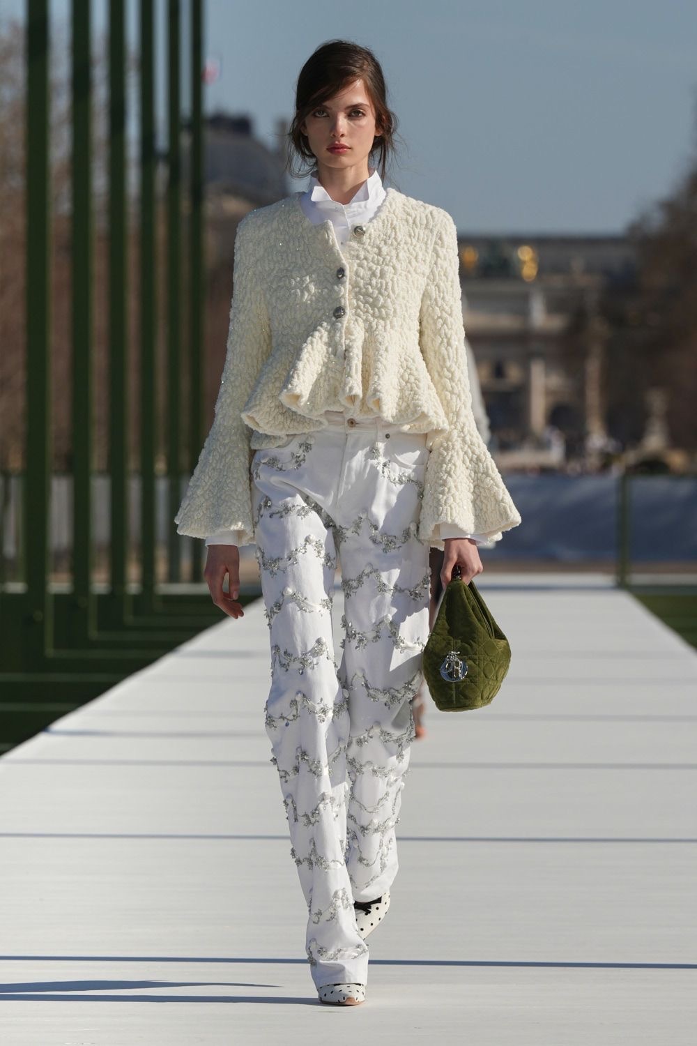 本季在杜乐丽花园发布,走在花园内中央大道上,人人都是风景。喷泉水雾在阳光下晕开光晕,让人想到莲花出水的瞬间——安静,却带着向上的力量。