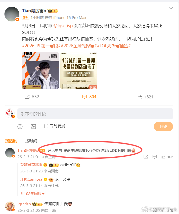 小天和刘青松发博咯,小天还在评论区开串,故意不删前面那句话,刘少化身捧场王第一时间回复到时候我有票我也来抽。