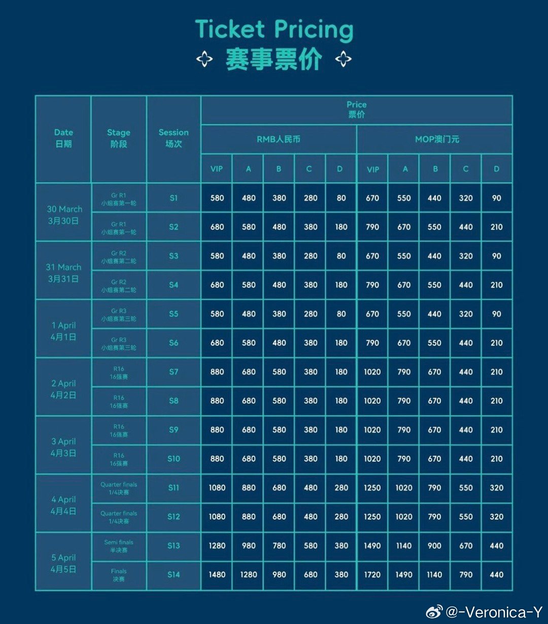 2026澳门世界杯·票价S1-S6(小组赛)——90-680元S7-S10(16-8)——210-880元S11-S12(8-4)——320-1080元S13-S14(半决赛/决赛)——440-1480元