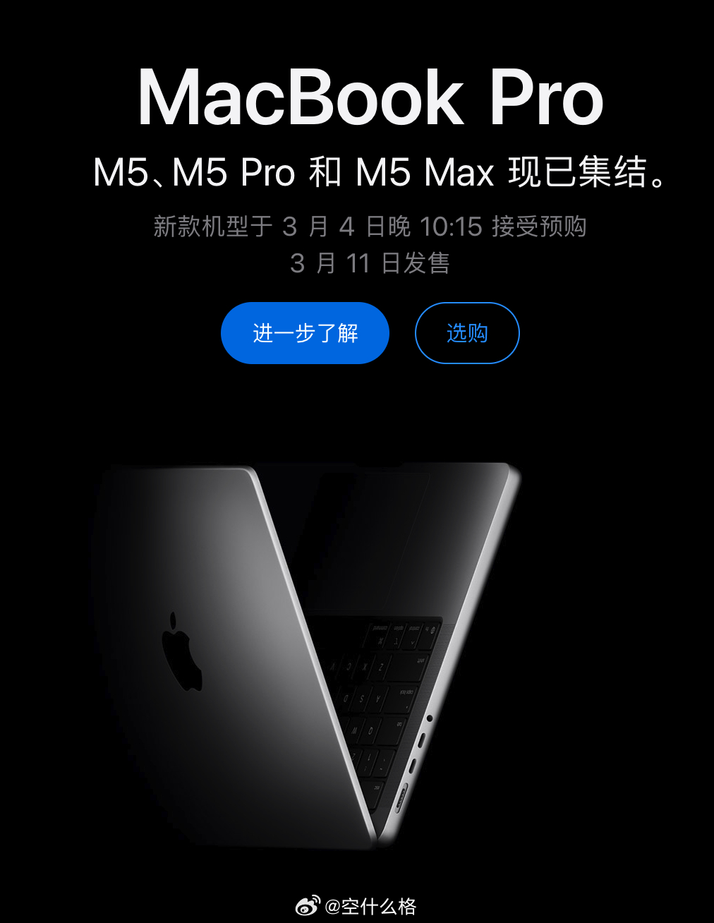 除了 MacBook Air 之外,M5 Pro/M5 Max 版本的 MacBook Pro 也来了,同样是外观不变芯片升级,起步容量升级为 1TB,起售价 17999 元起。