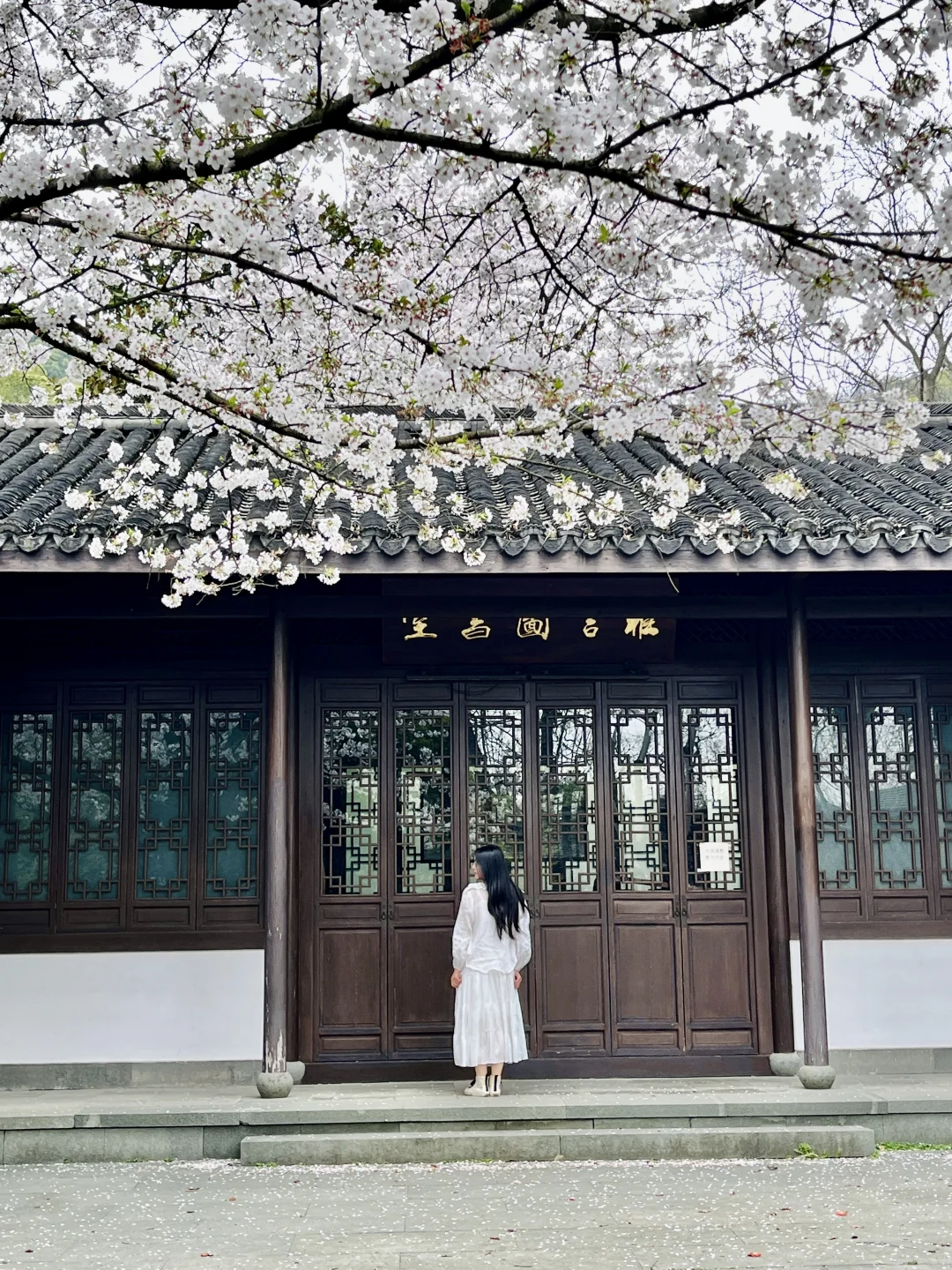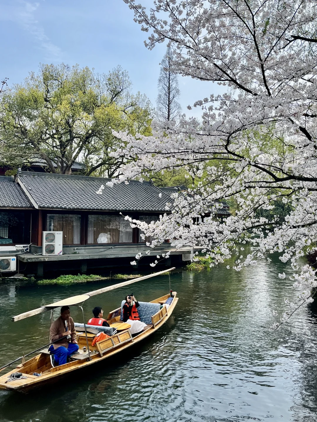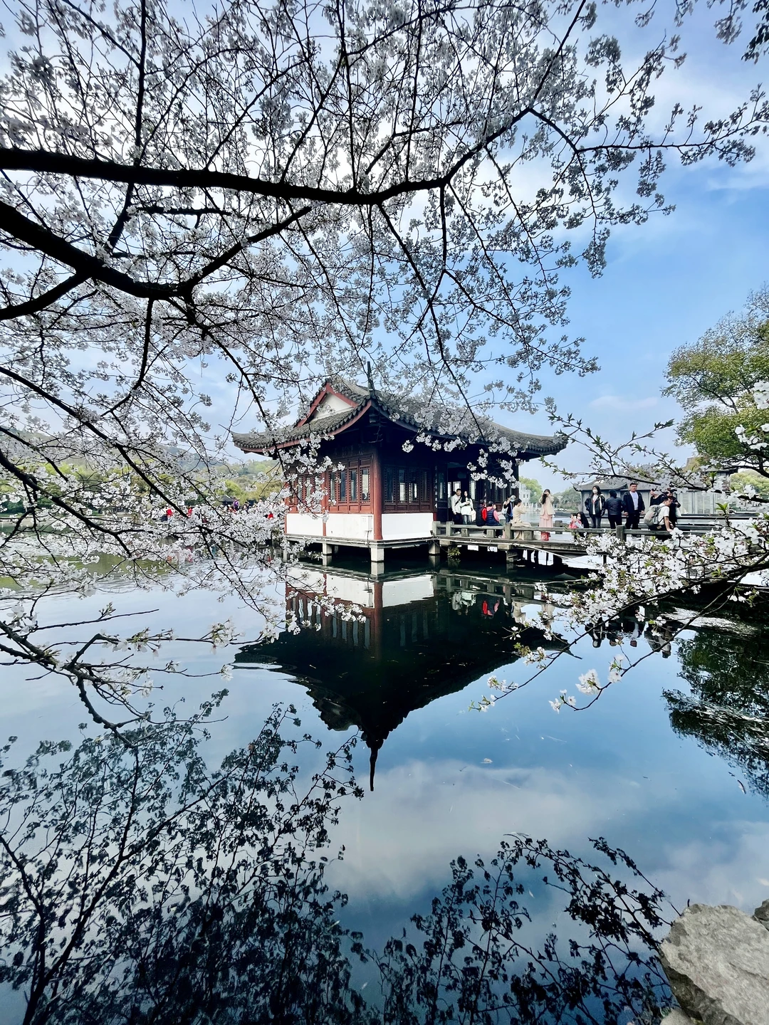 ✔️曲院风荷:杭州顶流赏樱之地,经典机位要排队,但工作日拍的人不算多。拍完往前走继续在拱桥上拍,拍到划过的乌篷船和樱花尊嘟好美