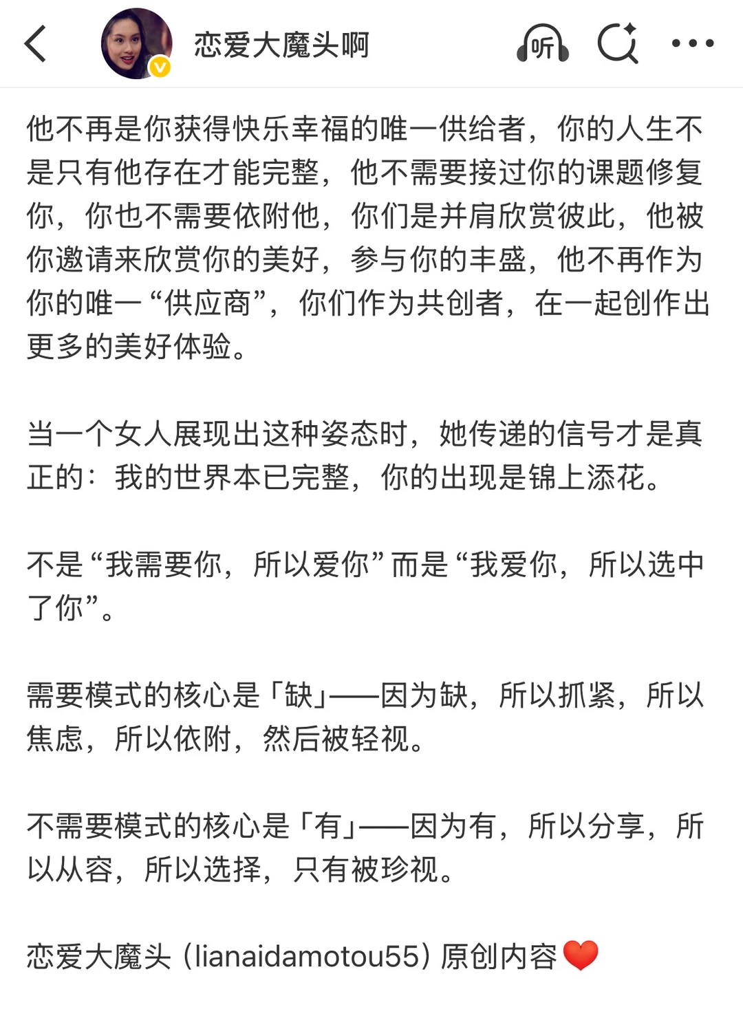 而“无需”模式的恋爱,是你邀请一个人进入你完整丰富的人生里看看。