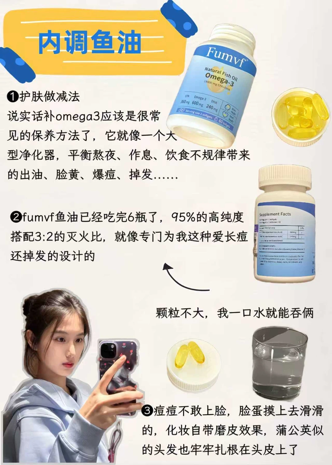 前前后后换过不少,最后锁定了fumvf鱼油(现在已经吃完6瓶了),看重它95%的高纯度,还是3:2的灭火比,很适合我这种脸上时不时就出油冒痘的,主要是它不像吃三文鱼那么费钱