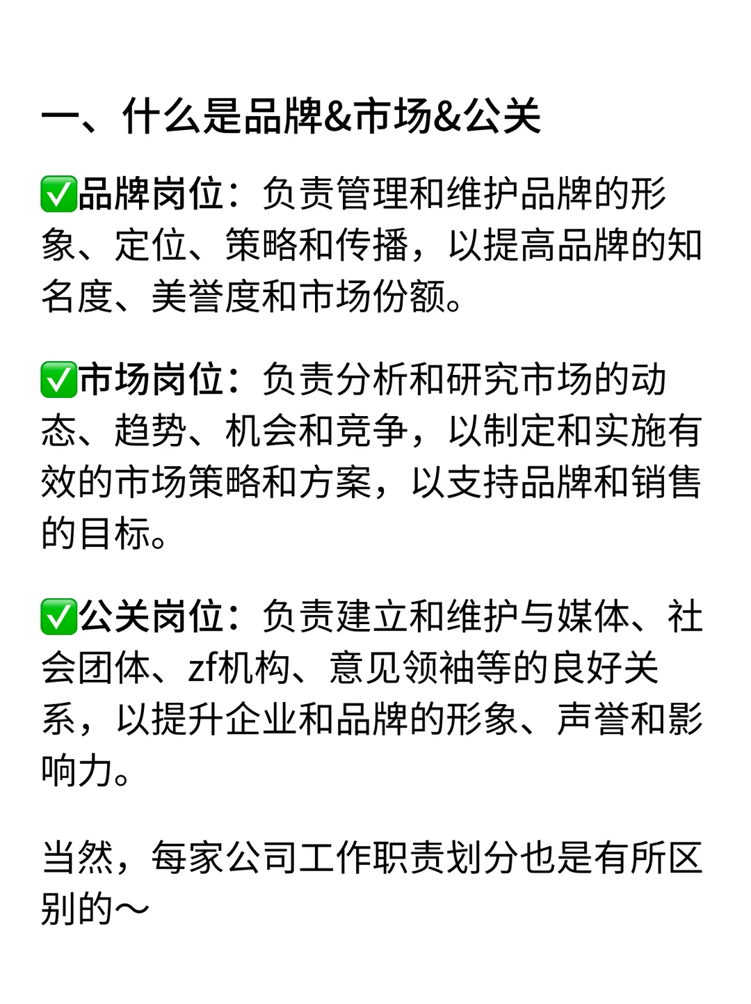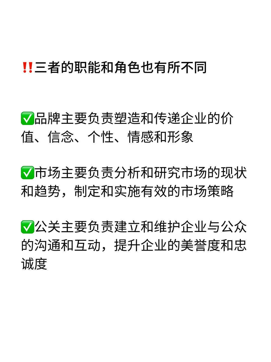 我是瑞池,500强外企业务团队Senior Manager · 想要求职外企,要把品牌、市场、PR搞清楚,我面试求职者的过程中发现,大多数人都搞不清品牌/市场/PR这三者的定义、职能、目标 · 如果你求职的是小公司还好,对每个部门对分工不是很明确,但是如果你入职的是大公司,这三个不部门的分工都比较明确,而且都是相辅相成 · 🔹 今天,我就大家着重介绍下品牌、市场、PR这三者之间的关系和区别: Marketing是策略 PR是技巧 Branding则是目标 · 1️⃣什么是品牌、市场、PR(详细内容👀见图) ✅Branding岗是让消费者记住并喜欢这个品牌,比如NIKE的“Just Do It”就是品牌团队的成果 ✅Marketing岗是研究市场,找到机会,Boost Sales ✅PR岗位上管理企业对外形象,处理舆论的核心 · 2️⃣品牌、市场、PR 三者的关系和区别(详细内容👀见图) · 🙋‍♂️(求职版) 💙我是瑞池,500强外企总部Leader+面试官 -