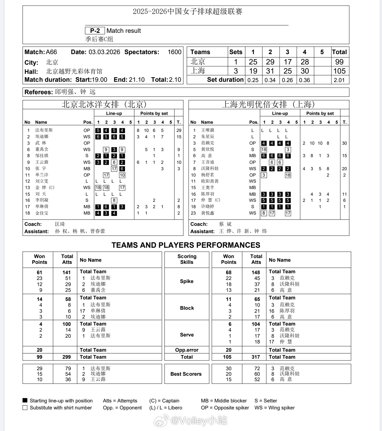 【技术统计】排超联赛季后赛第3轮,北京女排1比3上海女排(25-19 29-31