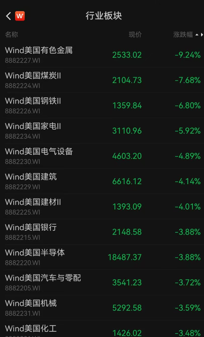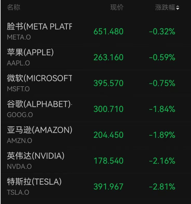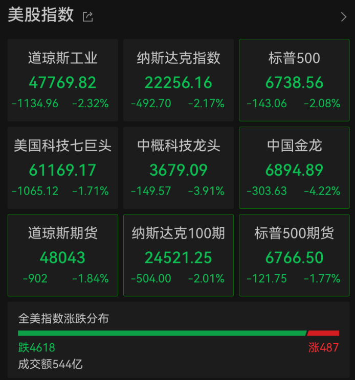 【#道指暴跌超1100点#】#加密货币超12万人爆仓# 3月3日晚,美股开盘后加速下挫。截至发稿,道指跌2.23%,暴跌超1100点;标普500指数、纳指均跌超2%。市场上,4618只个股下跌,487只个股上涨。盘面上,有色、煤炭、钢铁大跌,银行、半导体也重挫。美股科技七巨头全部下跌,截至发稿,特斯拉大跌2.8%。中概股跟随大盘下跌,纳斯达克中国金龙指数跌超4%。截至发稿,金山云跌11%,小鹏汽车跌8%,小米集团ADR跌6%,阿里巴巴跌5%,百度跌4.8%。商品市场,黄金白银价格持续下挫!截至发稿,现货黄金跌超5%,报5019美元/盎司,盘中跌破5000美元关口;现货白银暴跌超10%,跌破80美元/盎司。#美股科技七巨头全部下跌# (每经)