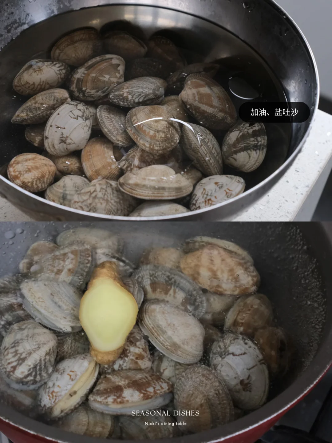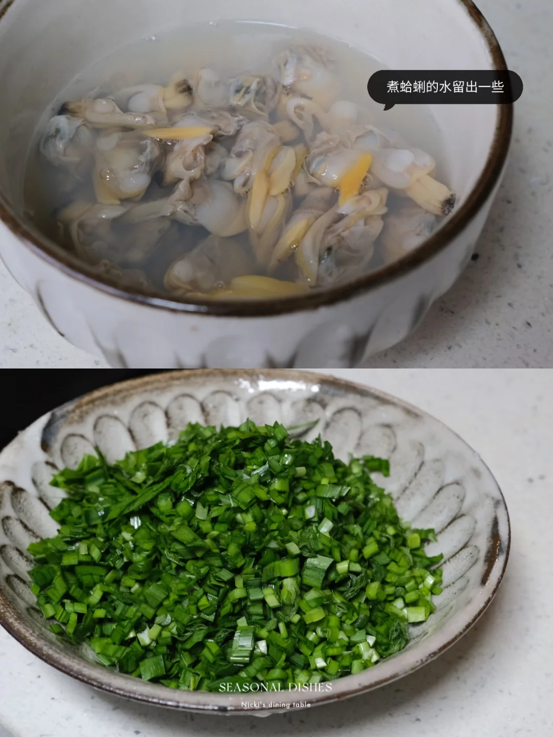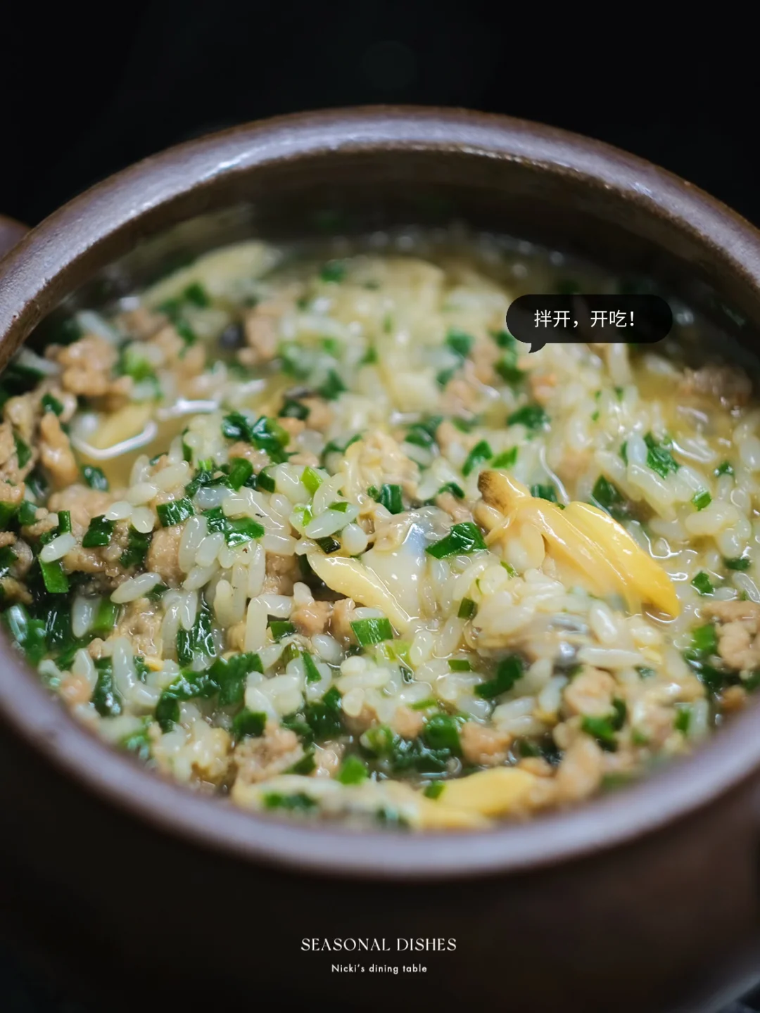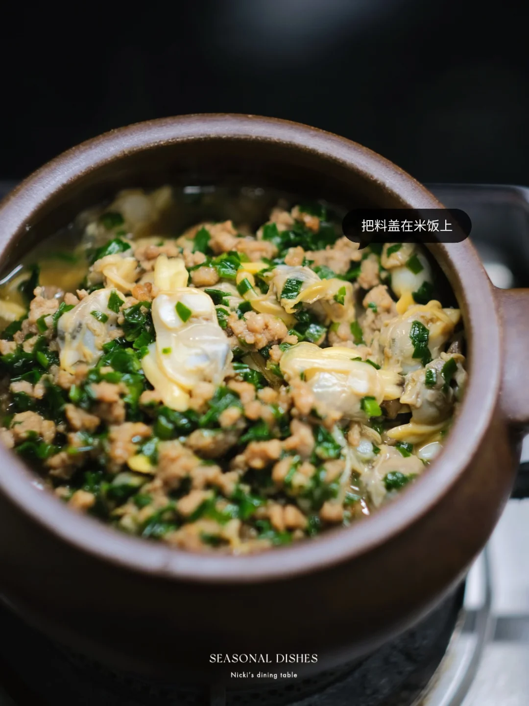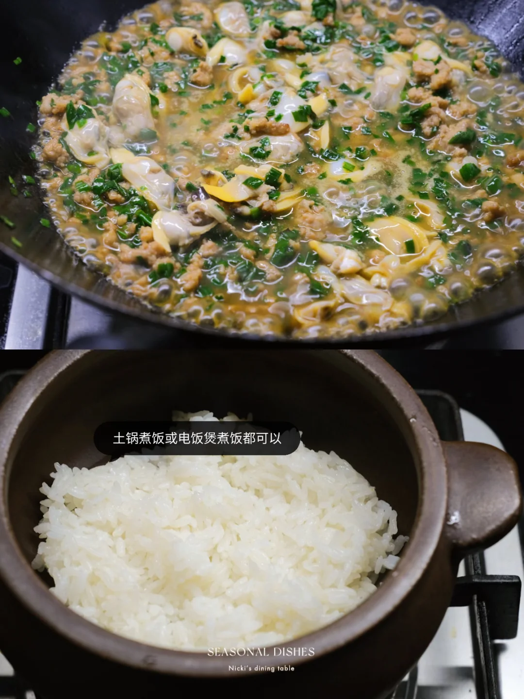 用蛤蜊代替海肠,更好上手,同样好吃… - 🍚菜谱:蛤蜊捞饭 ·蛤蜊加盐吐沙。 ·锅中煮水加姜片,倒入蛤蜊,煮到蛤蜊开口捞出。 ·将蛤蜊肉挑出,盛出一小碗煮蛤蜊的水备用。 ·肉糜中加料酒、盐拌匀腌制片刻。锅中倒油,放入肉糜炒熟后加生抽、蚝油,倒入韭菜末翻炒几下,加蛤蜊水,水淀粉,中火煮粘稠后,加入蛤蜊肉,翻炒几下即可。 ·将炒好的料倒入煮好的米饭上,拌匀开吃!