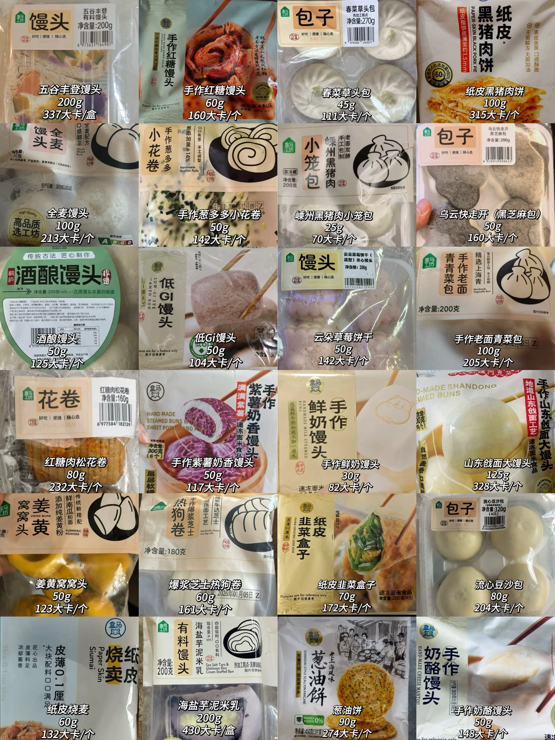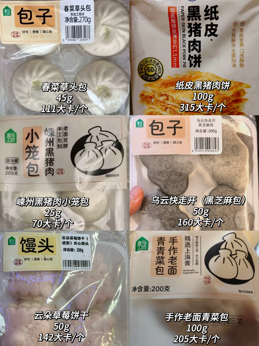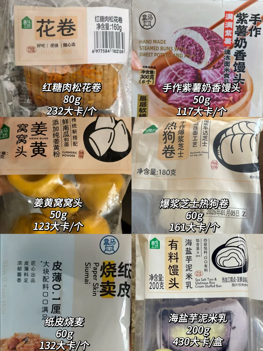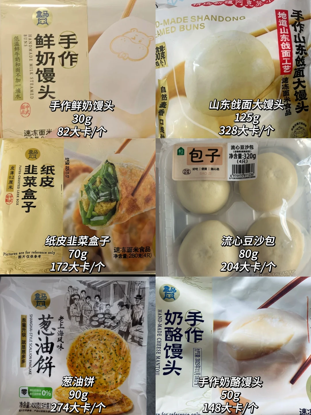 hello 大家好🙋 我是莹莹 一个喜欢研究外食不长胖的女孩👧 今天来测评盒马的面食热量 看看他们的热量有多少吧~ 【0-200大卡】(从低到高) 1️⃣嵊州黑猪肉小笼包70大卡/个 2️⃣手作鲜奶馒头82大卡/个 3️⃣低Gi馒头104大卡/个 4️⃣春菜草头包111大卡/个 5️⃣手作紫薯奶香馒头117大卡/个 6️⃣姜黄窝窝头123大卡/个 7️⃣酒酿馒头125大卡/个 8️⃣纸皮烧麦132大卡/个 9️⃣手作葱多多小花卷142大卡/个 🔟云朵草莓饼干馒头142大卡/个 1️⃣1️⃣手作奶酪馒头148大卡/个 1️⃣2️⃣乌云快走开黑芝麻包160大卡/个 1️⃣3️⃣手作红糖馒头160大卡/个 1️⃣4️⃣爆浆芝士热狗卷161大卡/个 1️⃣5️⃣纸皮韭菜盒子172大卡/个 ✅以上的个头会小一点所以姐妹们可以吃两个或者是选一个搭配鸡蛋这样早餐热量会在300大卡左右哦~ 【200-500大卡】 1️⃣流心豆沙包204大卡/个 2️⃣手作老面青菜包205大卡/个 3️⃣全麦馒头213大卡/个 4️⃣红糖肉松花卷232大卡/个 5️⃣葱油饼274大卡/个 6️⃣纸皮黑猪肉饼315大卡/个 7️⃣山东戗面馒头328大卡/个 8️⃣五谷丰登馒头337大卡/盒 9️⃣海盐芋泥米乳430大卡/盒 ✅这些的热量会高一点点建议搭配一杯美式可以稳住一点升糖~ 好啦,本期的分享就到这里啦 我们下期再见👋