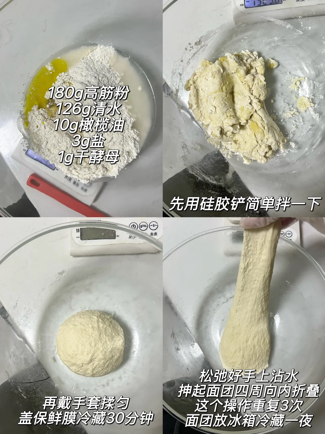 高筋粉180g、清水126g、橄榄油10g、干酵母1g、盐3g