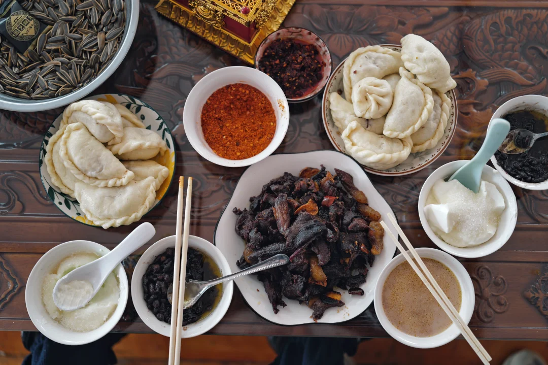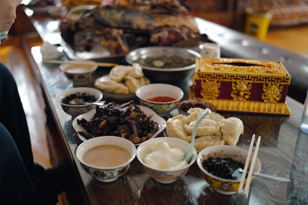 到了他家,安排了传统酥油茶,酸奶,牦牛肉包