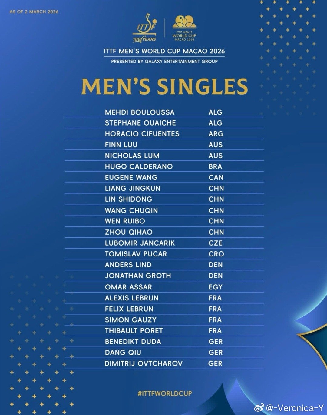 2026澳门世界杯·男单全名单两张外卡:朴康贤🇰🇷麦天恩🇲🇴